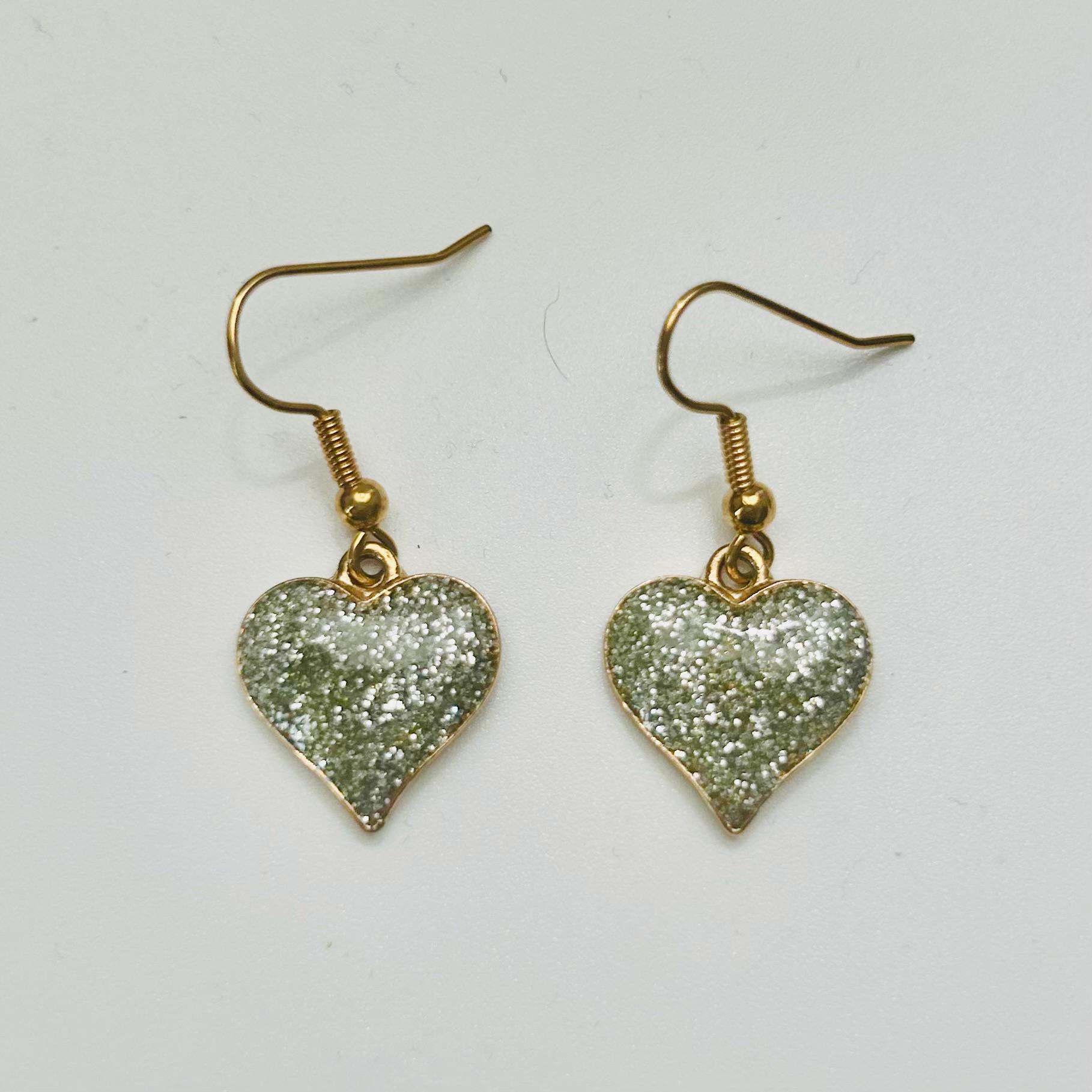 Sparkly Silver Glitter Heart charm earrings. These earrings dangle from gold plated hook ear wires. Heart is 15mm.