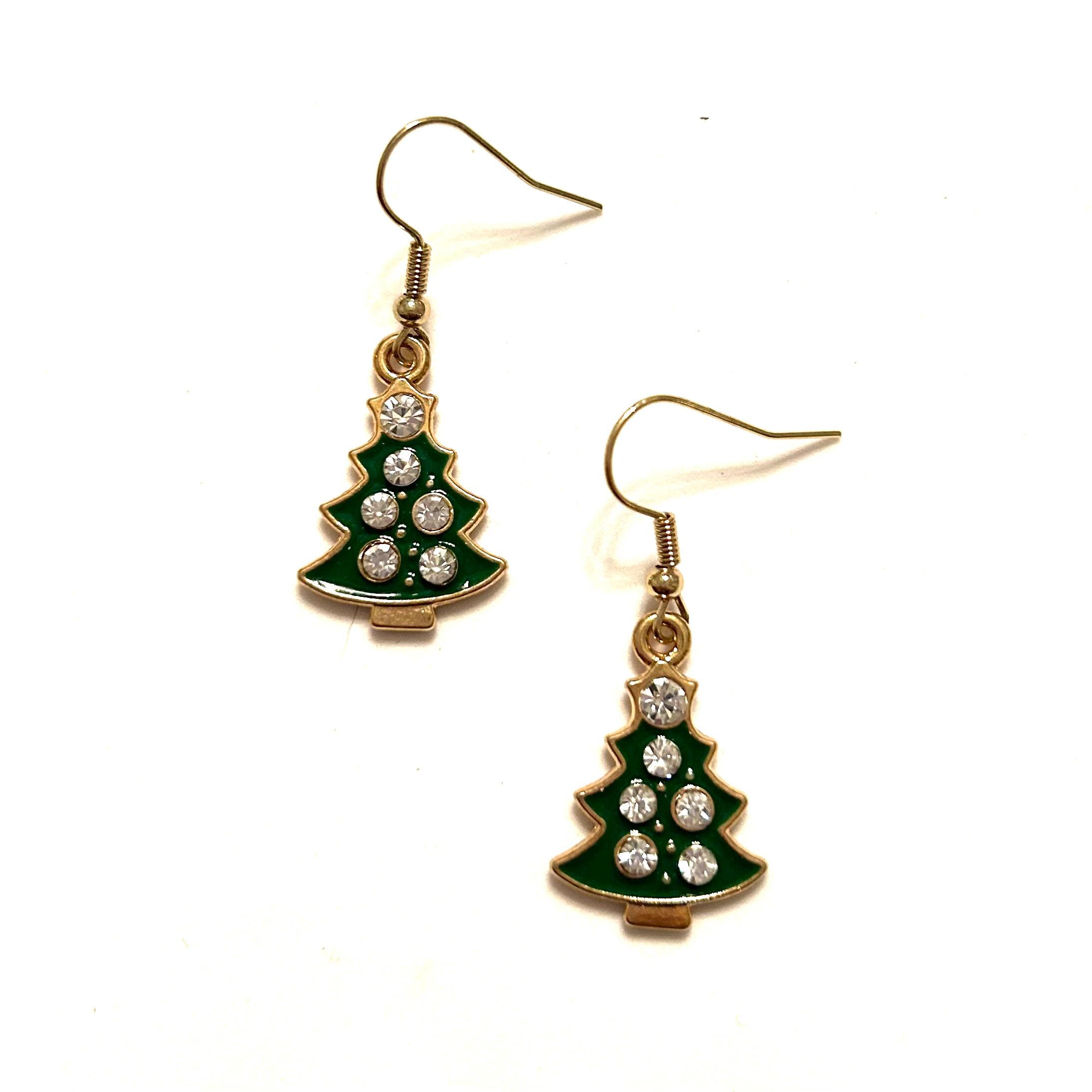 Green enamel and rhinestone Christmas tree earrings. These earrings dangle from gold plated hook ear wires. Great stocking stuffer.