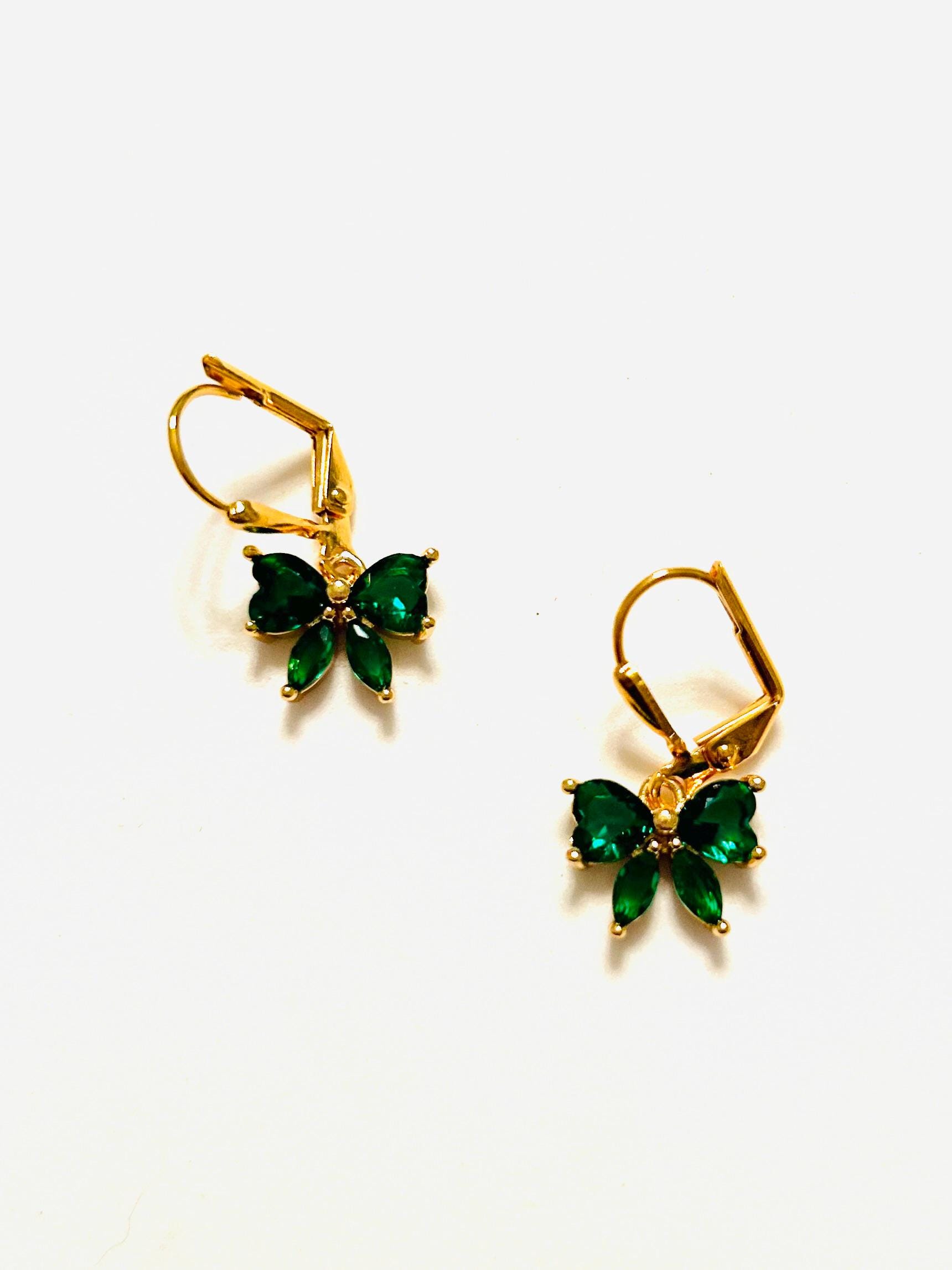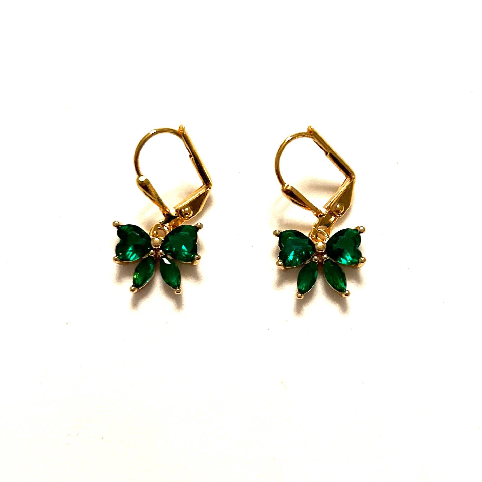 Green cz Christmas bow charm earrings. These earrings dangle from a gold plated lever back setting. Great stocking stuffer.