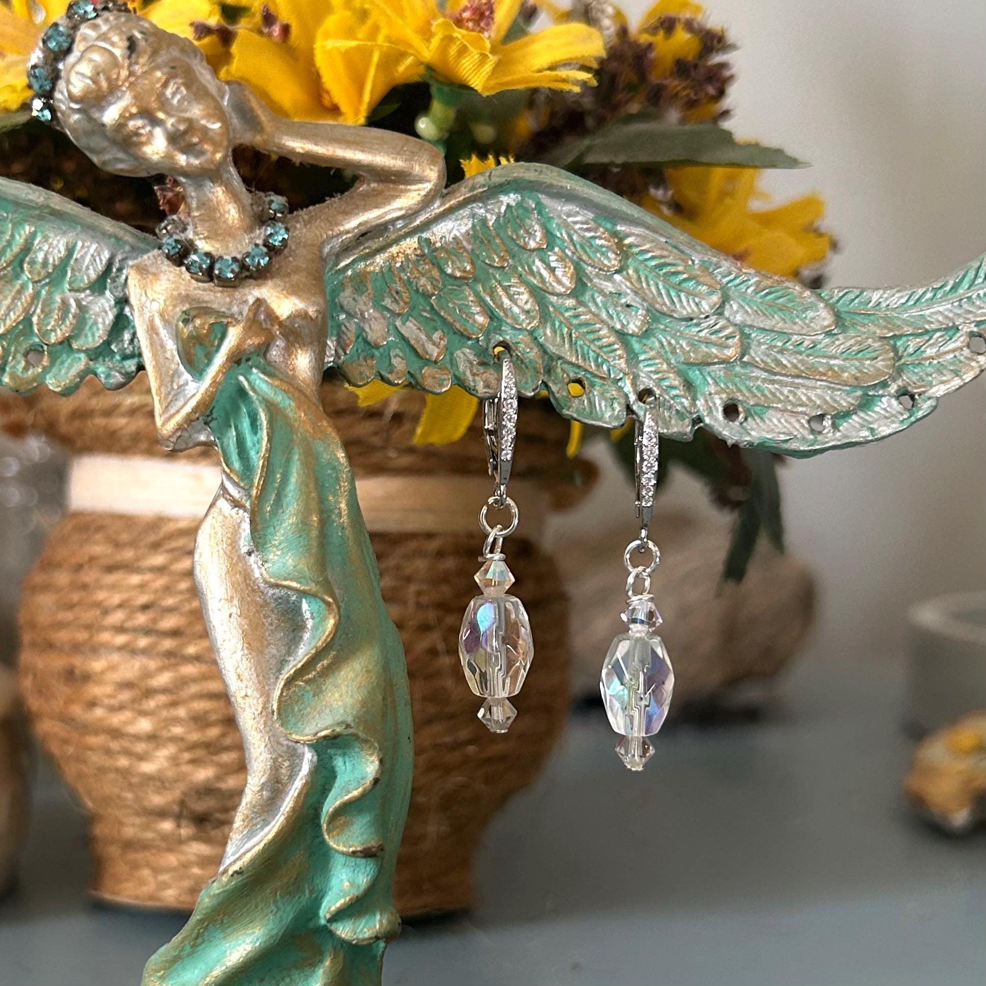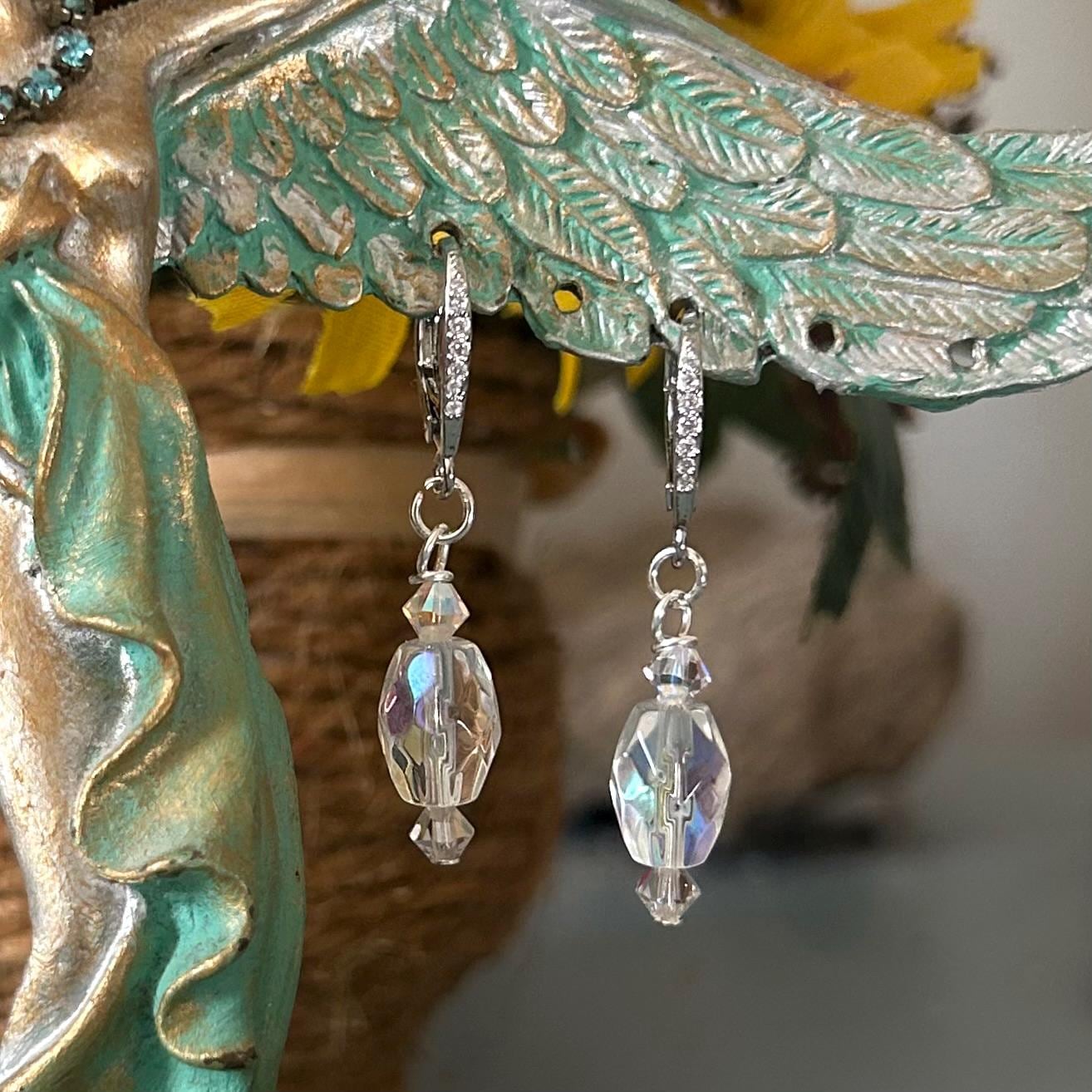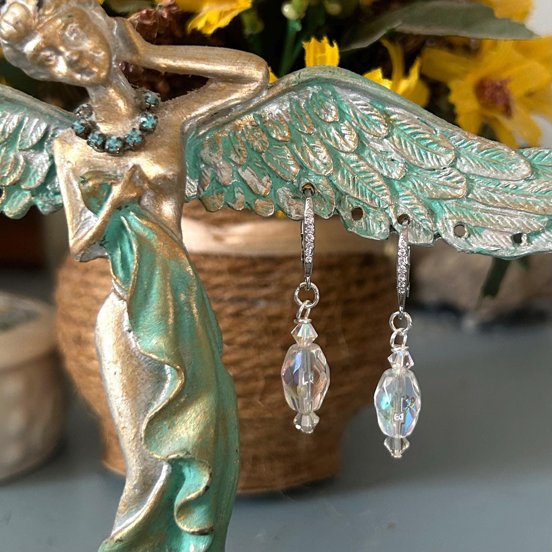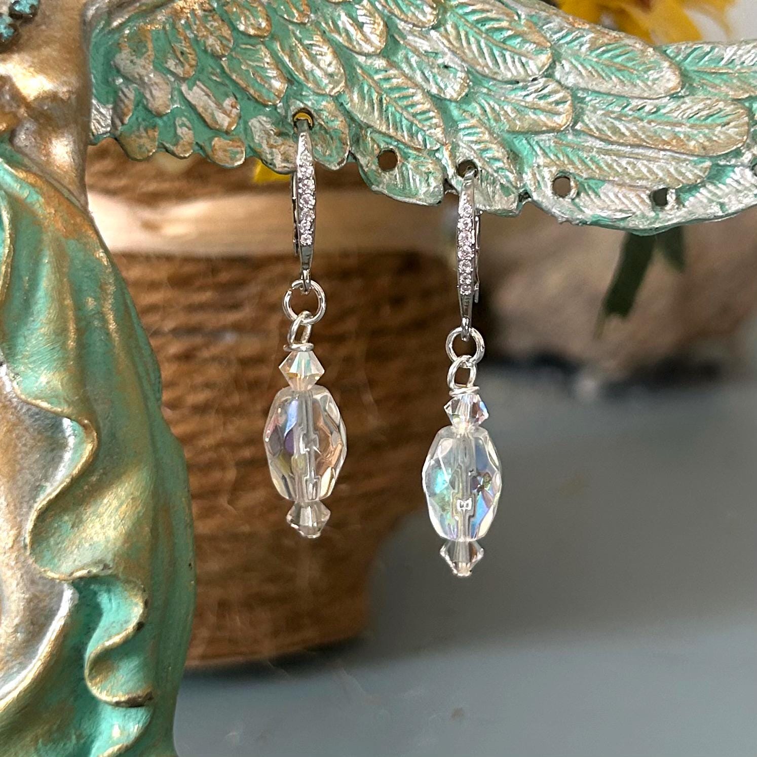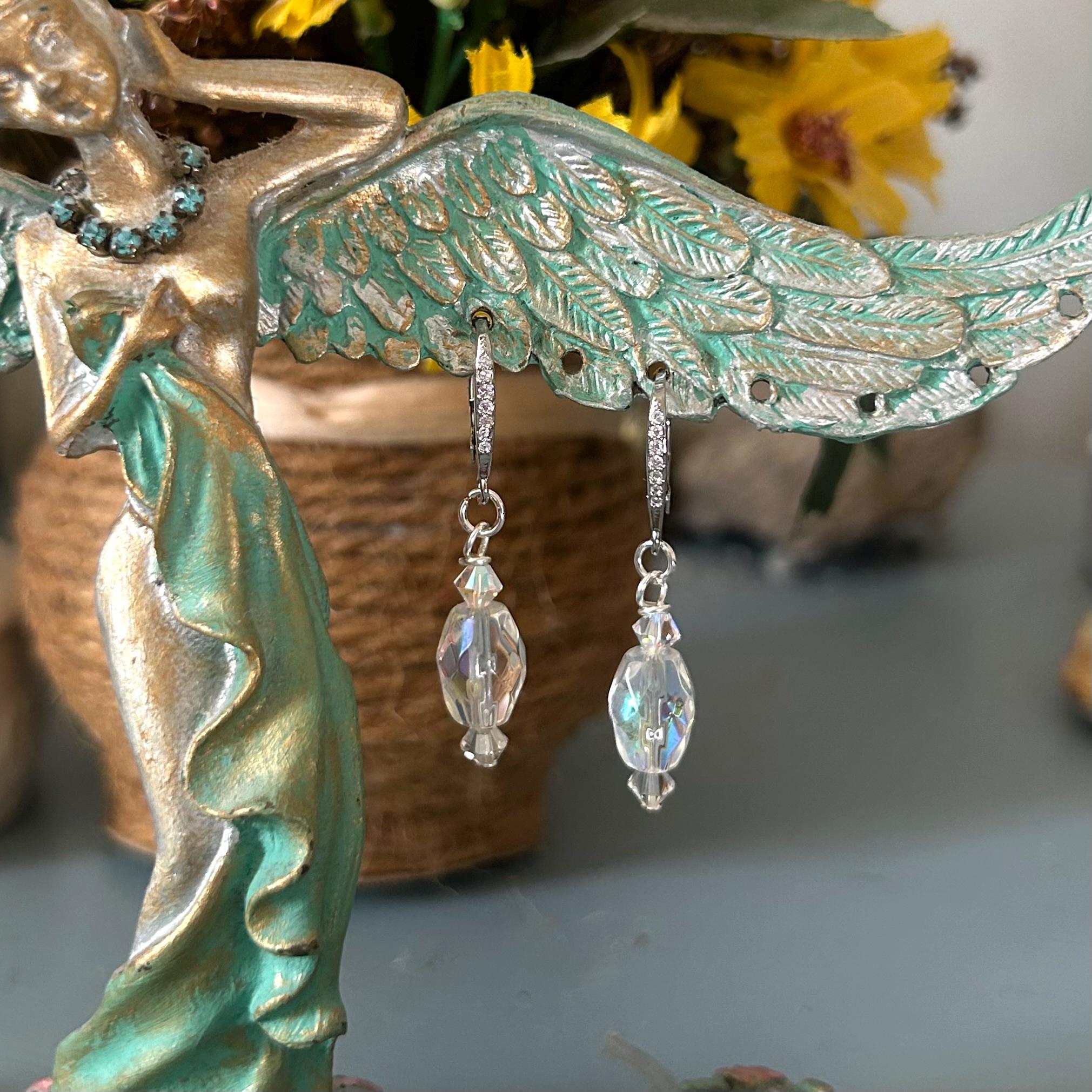 AB Crystal teardrop dangle earrings. These earrings dangle from a cubic zirconia silver plated lever back setting. 14mm. Very elegant earrings.
