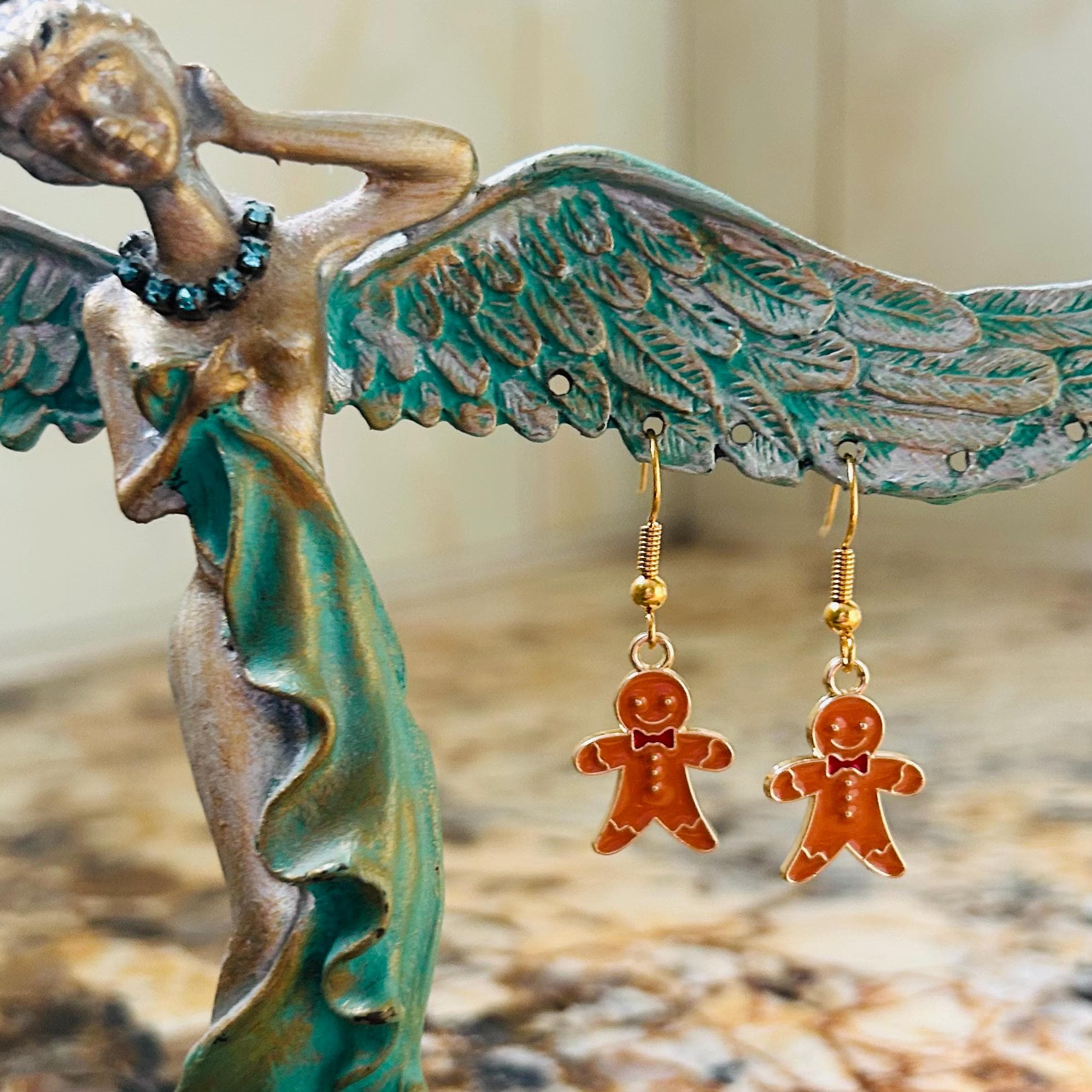 Cute enamel Gingerbread Man holiday earrings. These earrings dangle from gold plated hook ear wires. Great stocking stuffer.