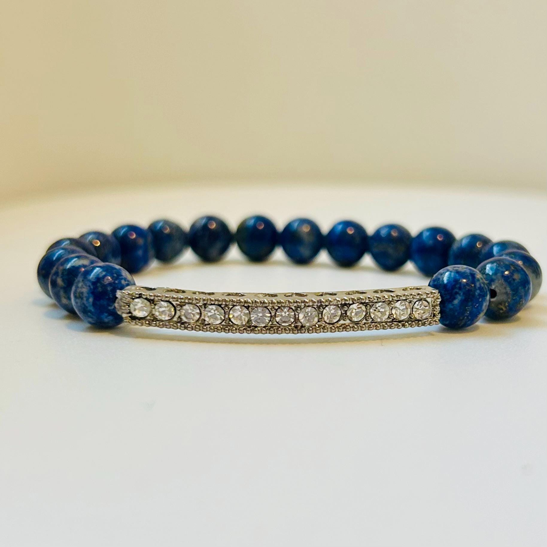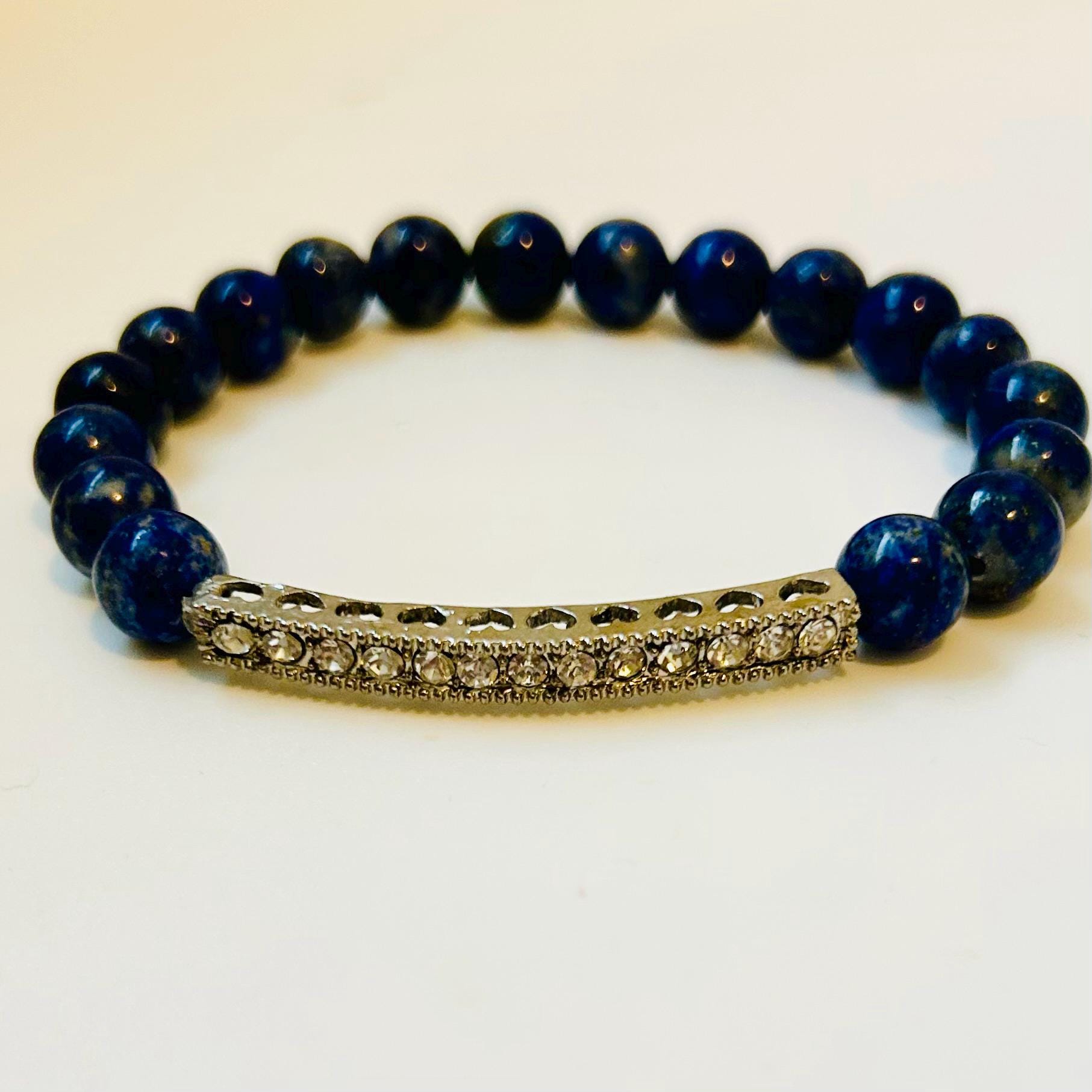 Lapis Lazuli beaded stretch bracelet with a silver-plated rhinestone connector. Beads are 8mm and bracelet is approximately 7”. Fits average woman’s wrist. Beautiful bracelet!