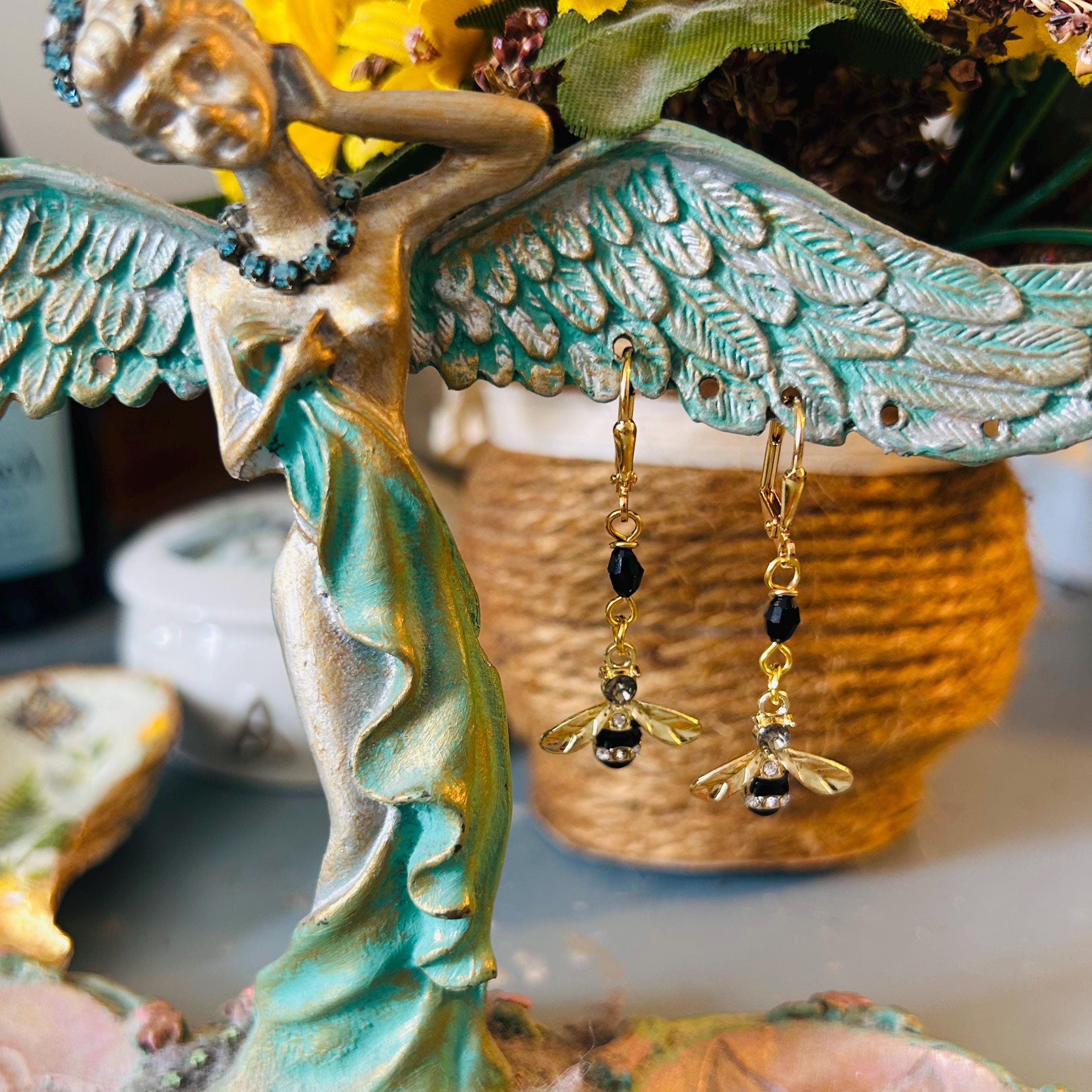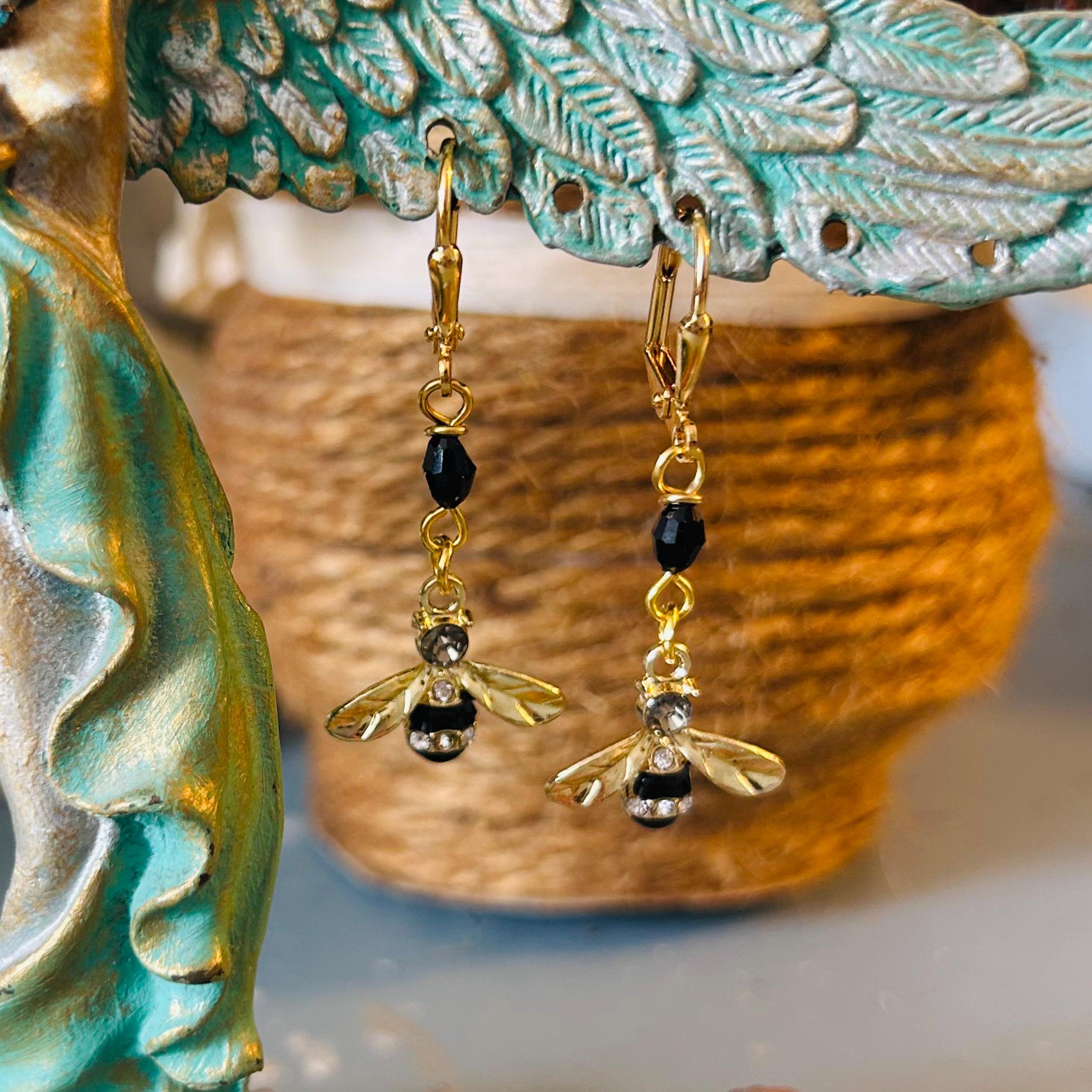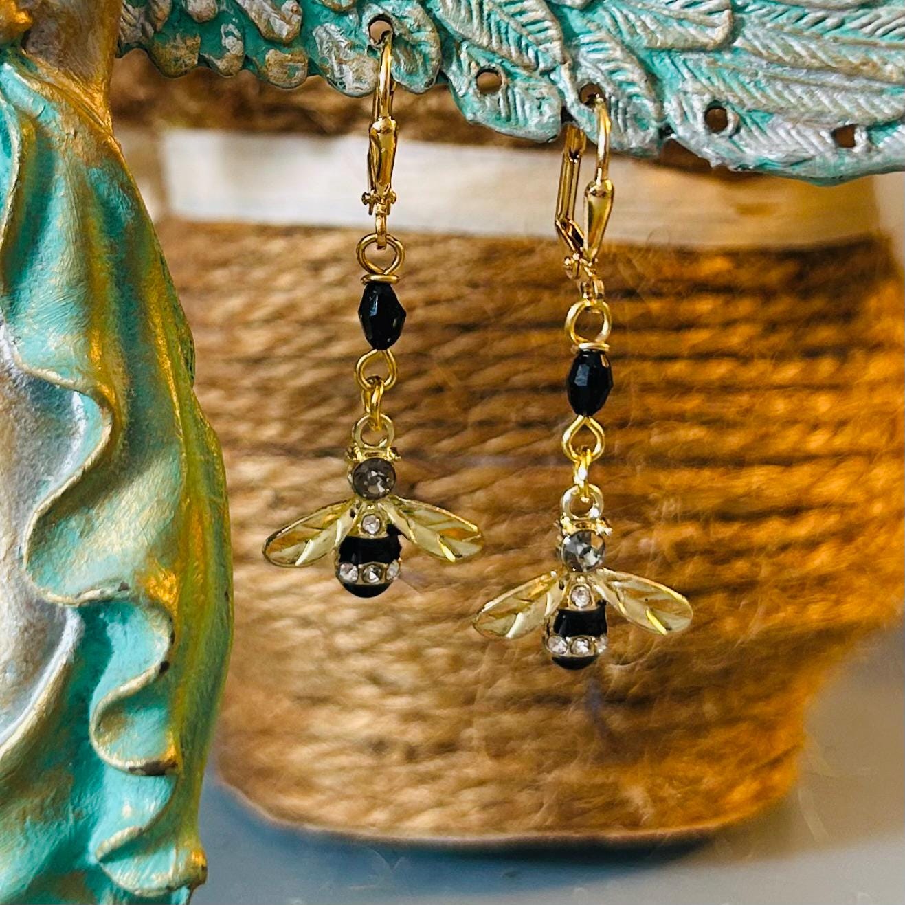 Gold plated bee charm earrings with black enamel and rhinestone accents. These earrings dangle from gold plated lever backs. Charms approximately 3/4”. Very cute earrings.