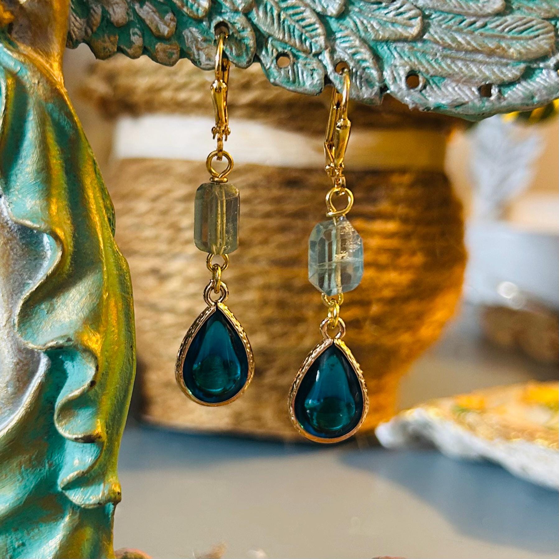 Blue Fluorite and Peacock Blue Glass gold plated bezel set charm earrings. These earrings dangle from a gold plated lever back setting.