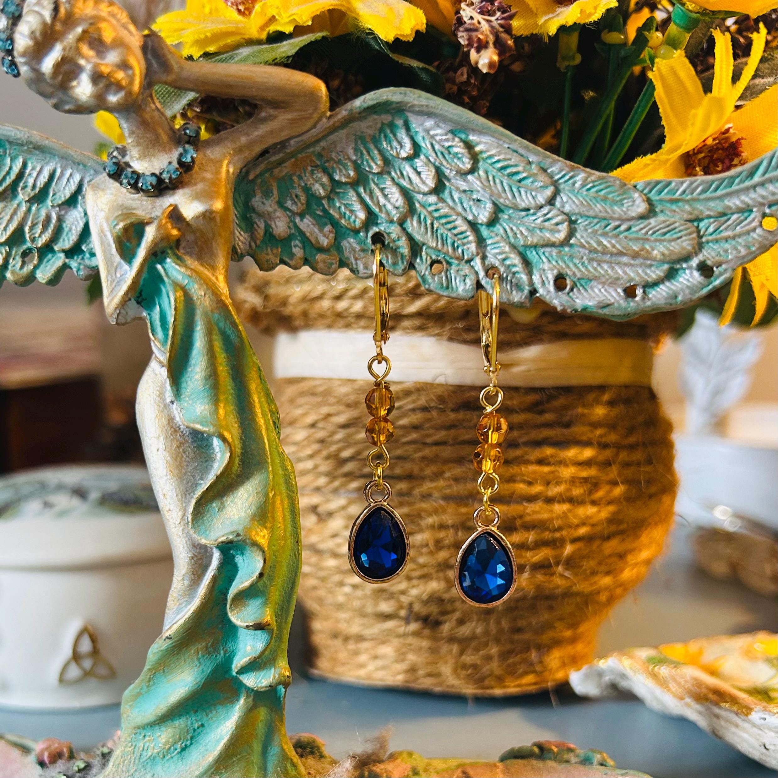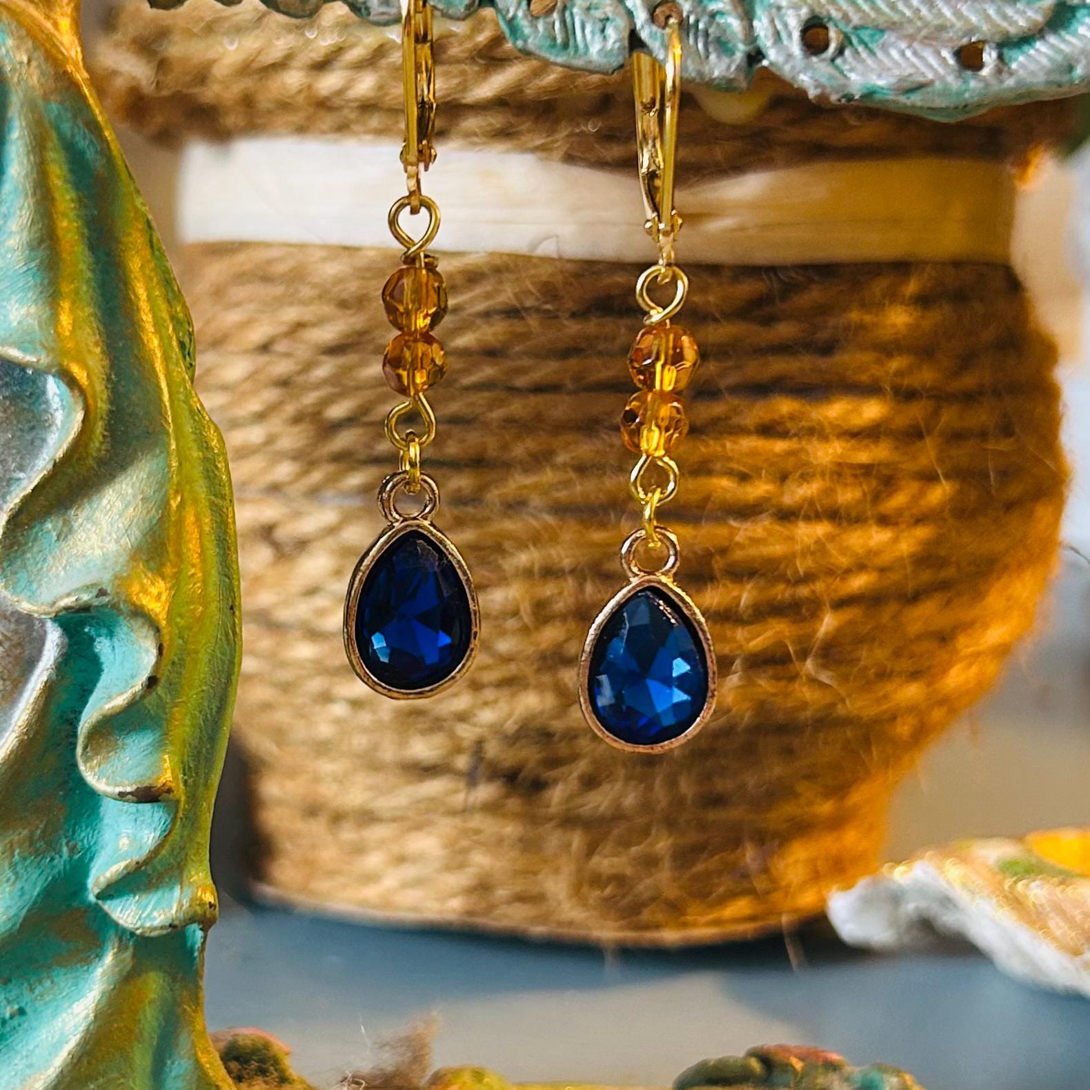 Sapphire blue teardrop gold plated bezel set charm earrings with amber tone glass accents. These earrings date from gold plated lever backs. Very pretty earrings!