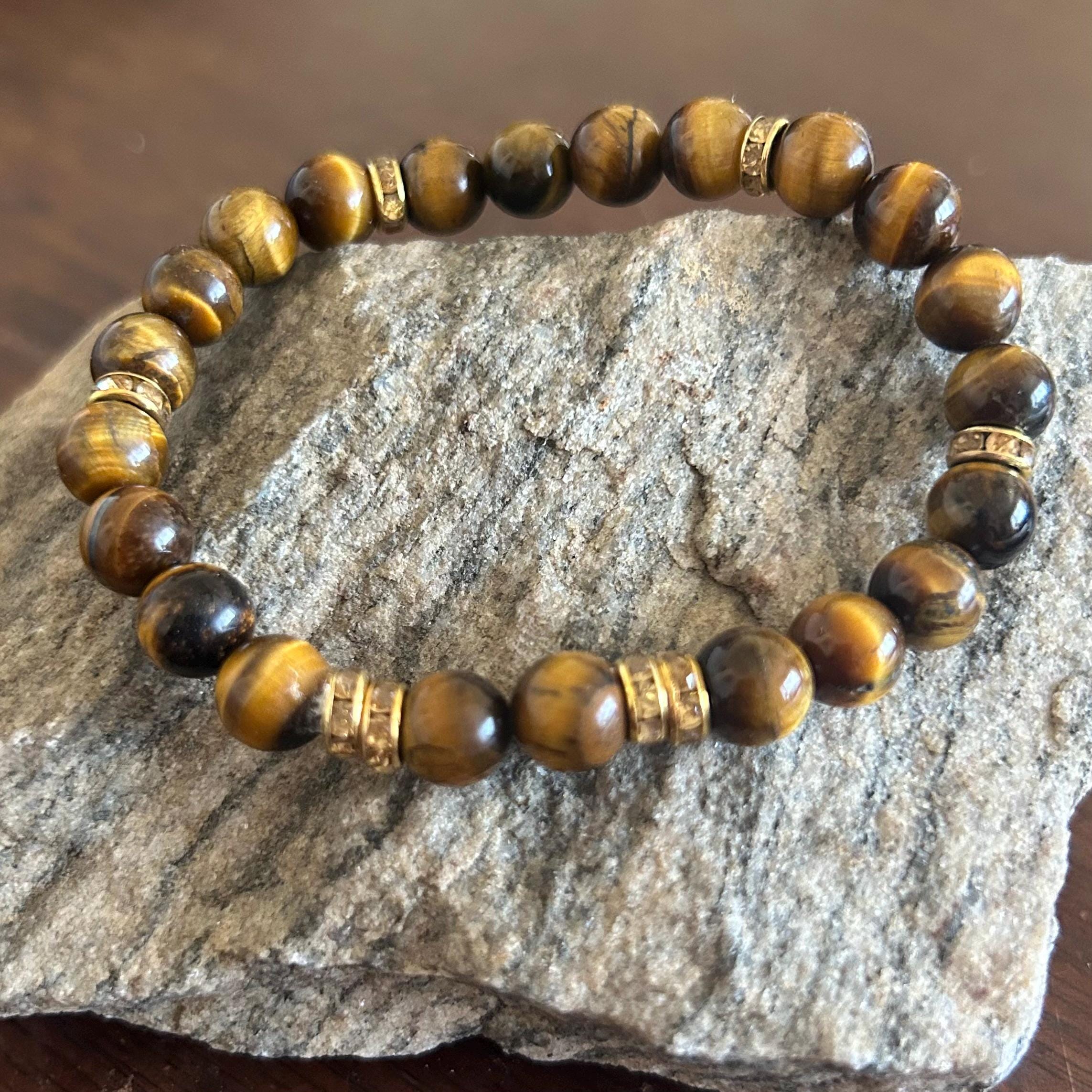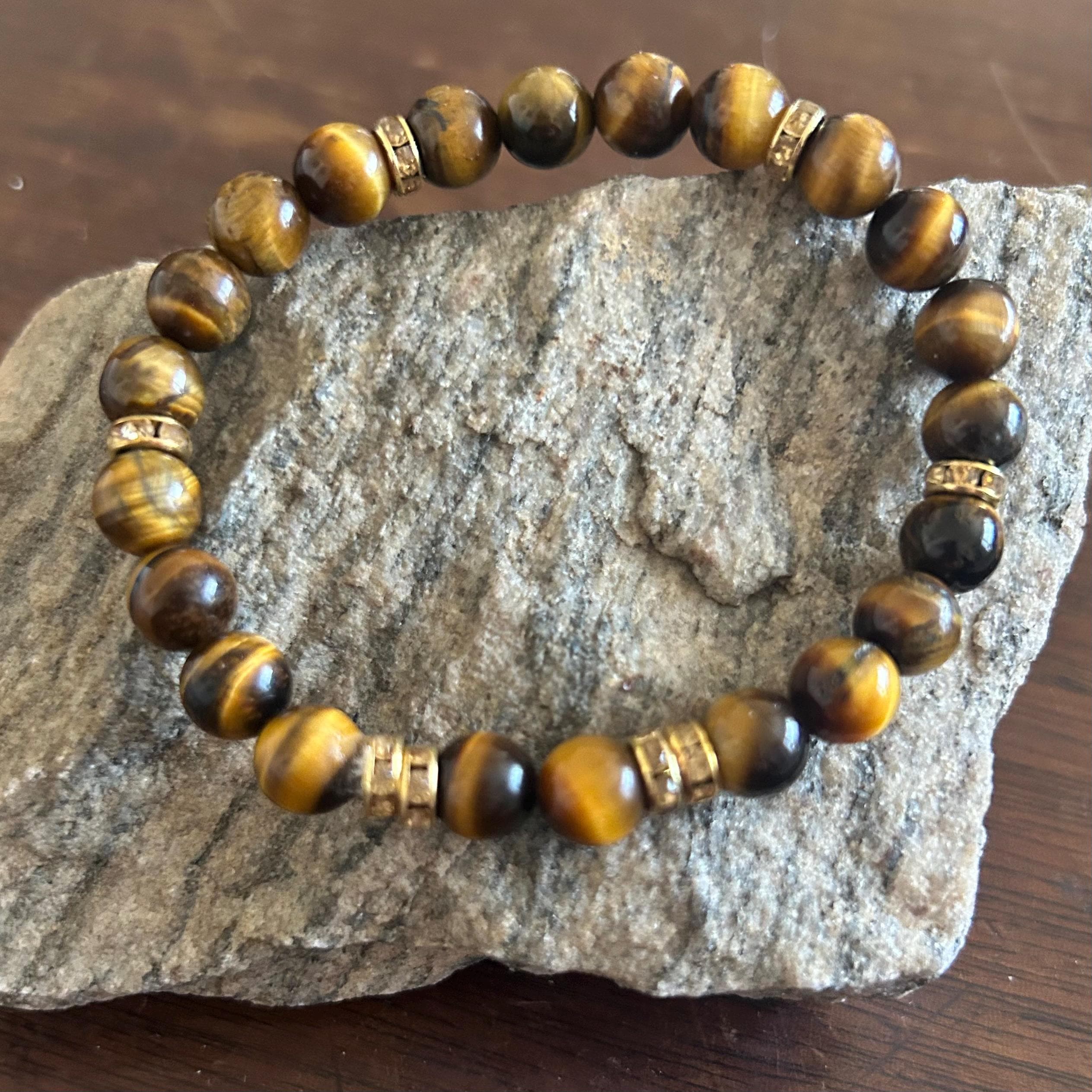Tiger's Eye Stretch Bracelet enhanced with gold rhinestone spacers. Beads are 8mm. Bracelet approximately 7 inches. Fits average woman’s wrist.