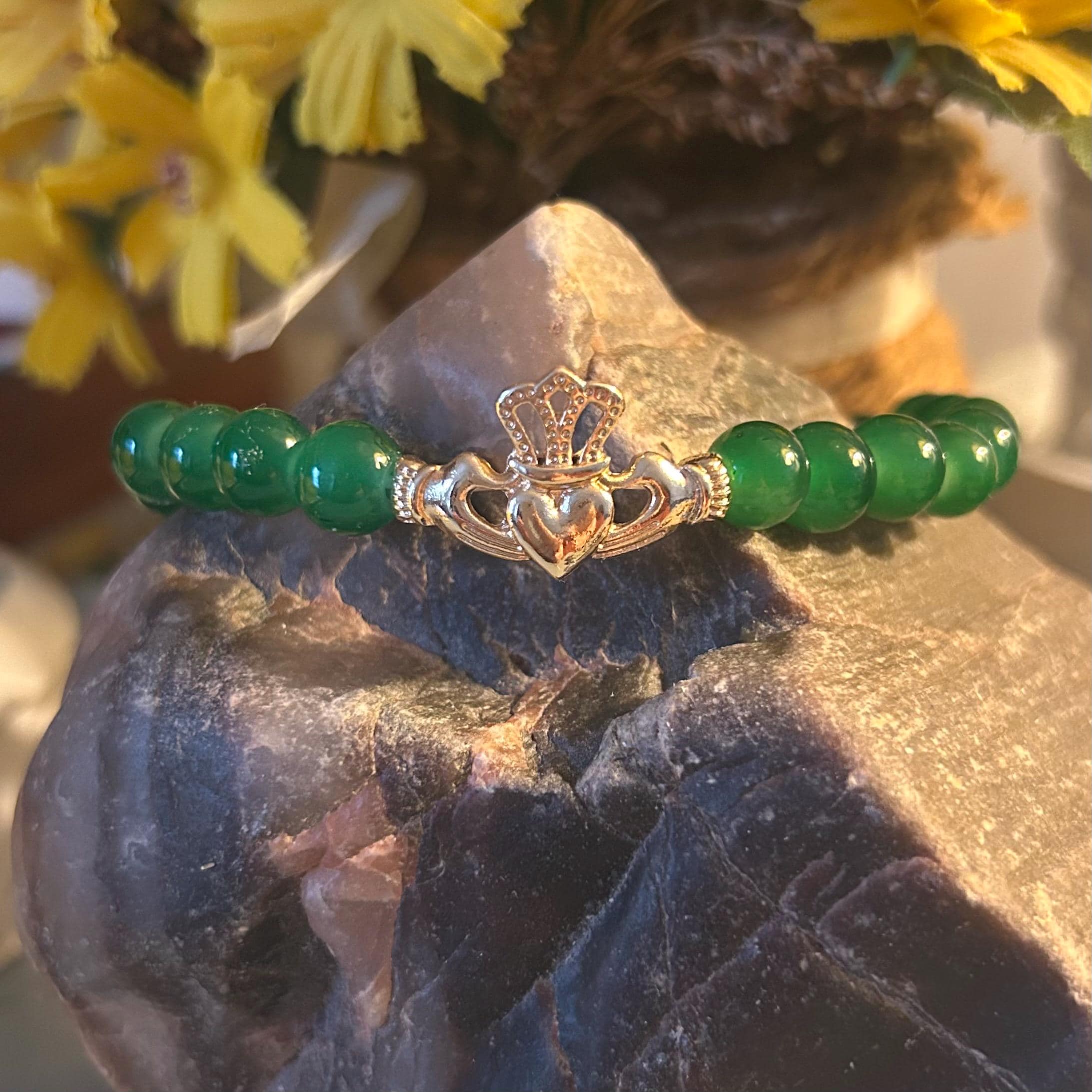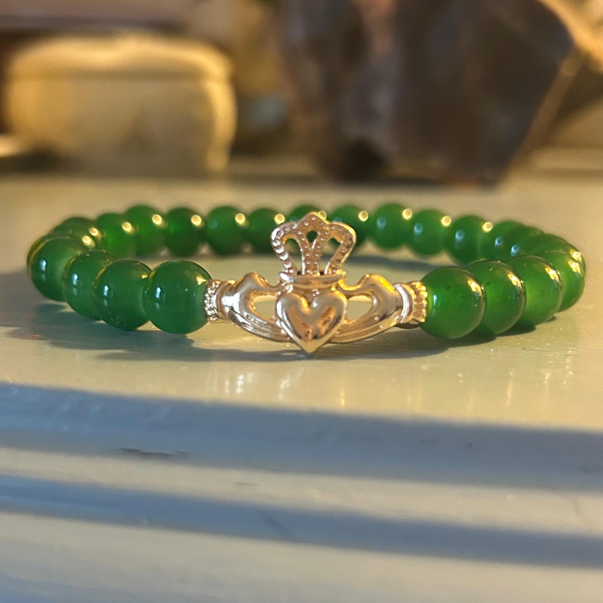 Beaded Aventurine stretch bracelet with gold tone Claddagh charm. 8mm beads. Fits average woman’s wrist.