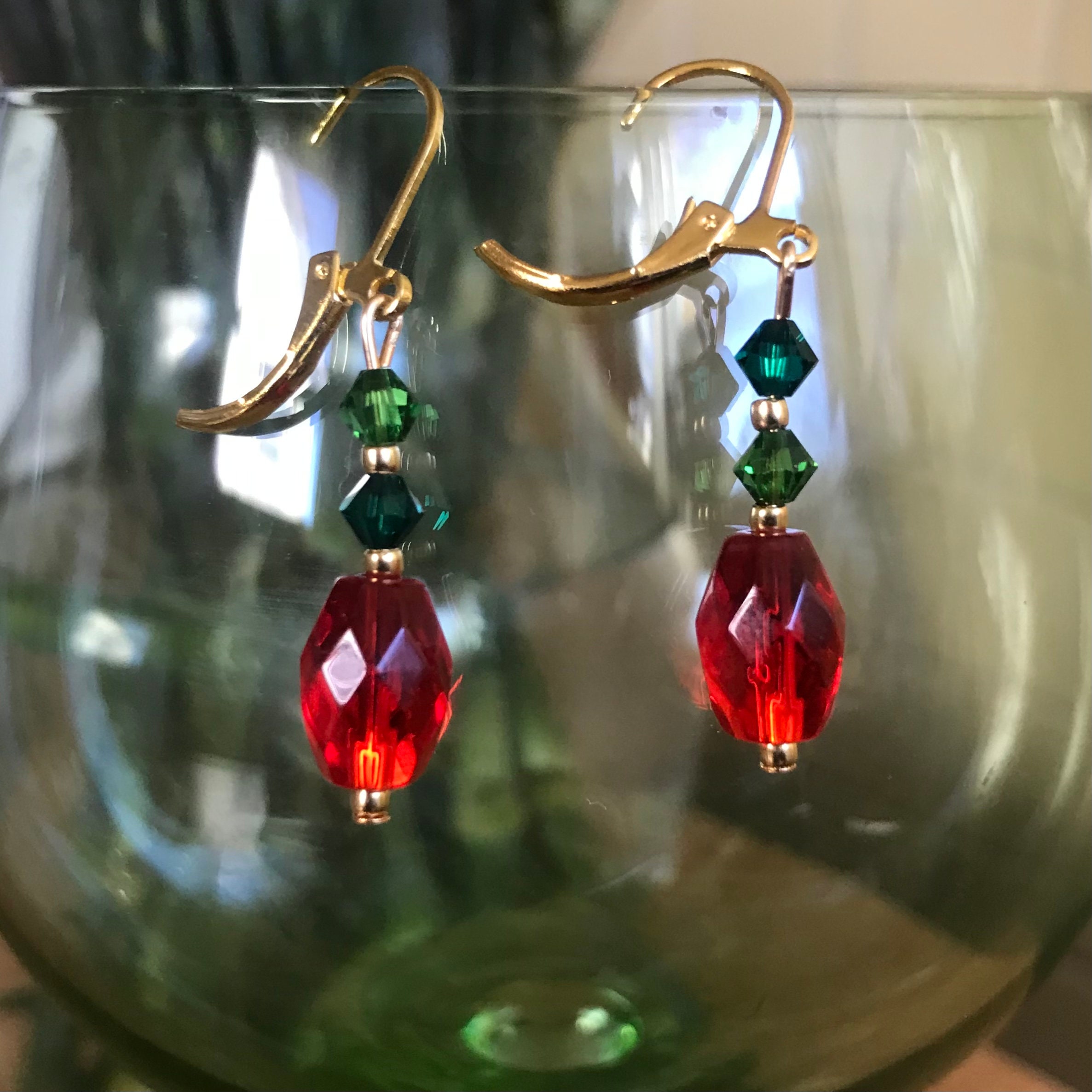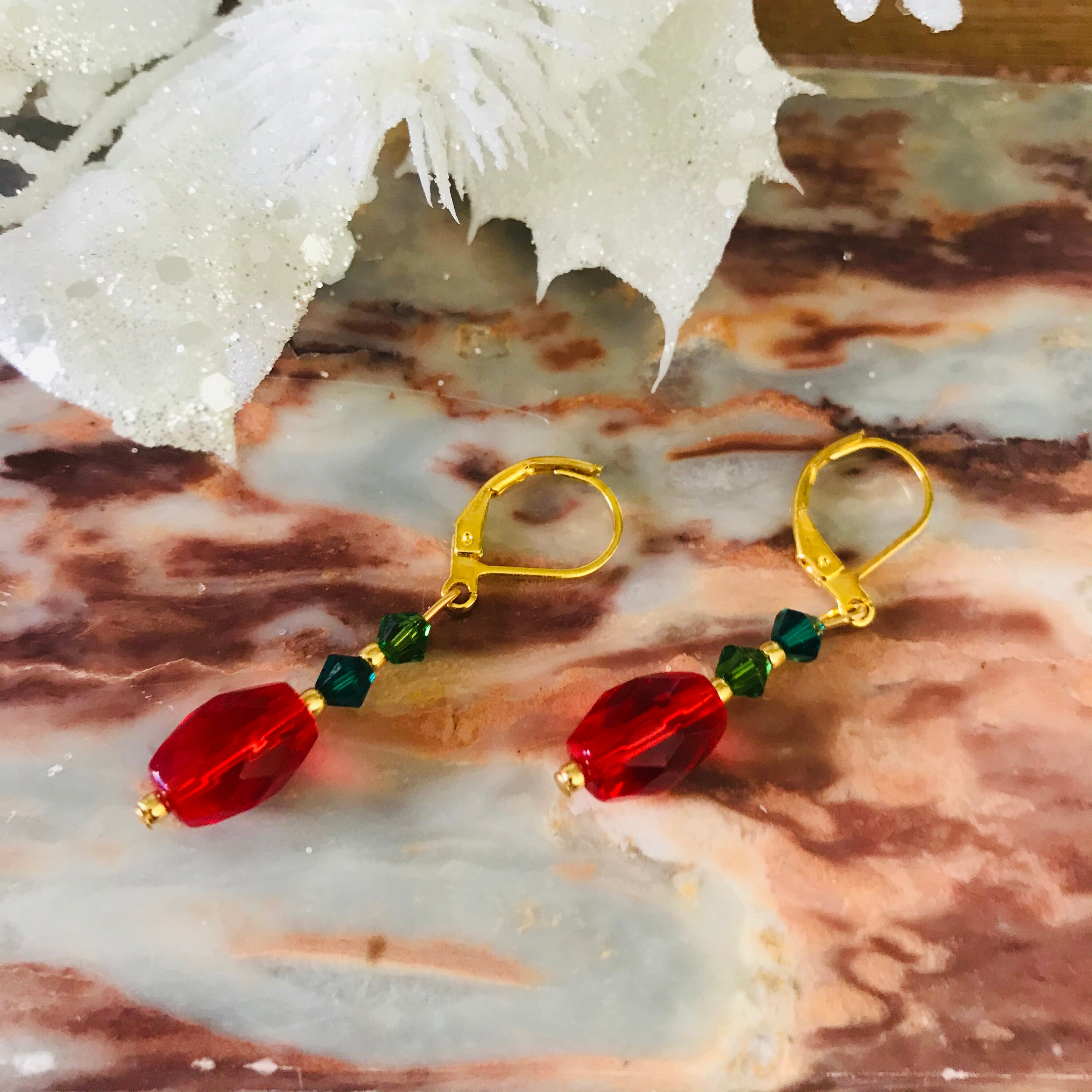 Beautiful combination of red teardrop glass and green Swarovski crystal earrings. These earrings dangle from a gold plated lever back setting. Beautiful holiday earrings!