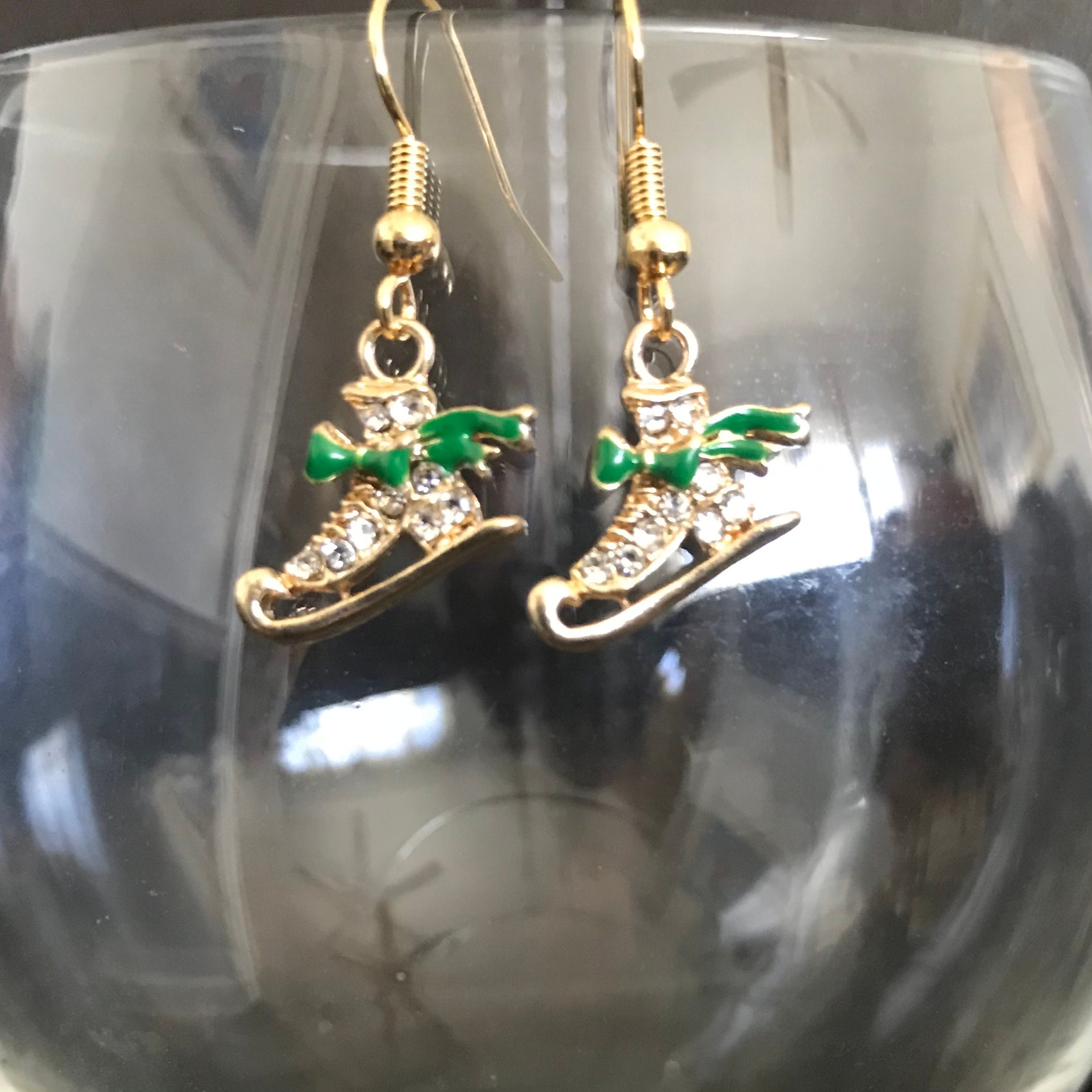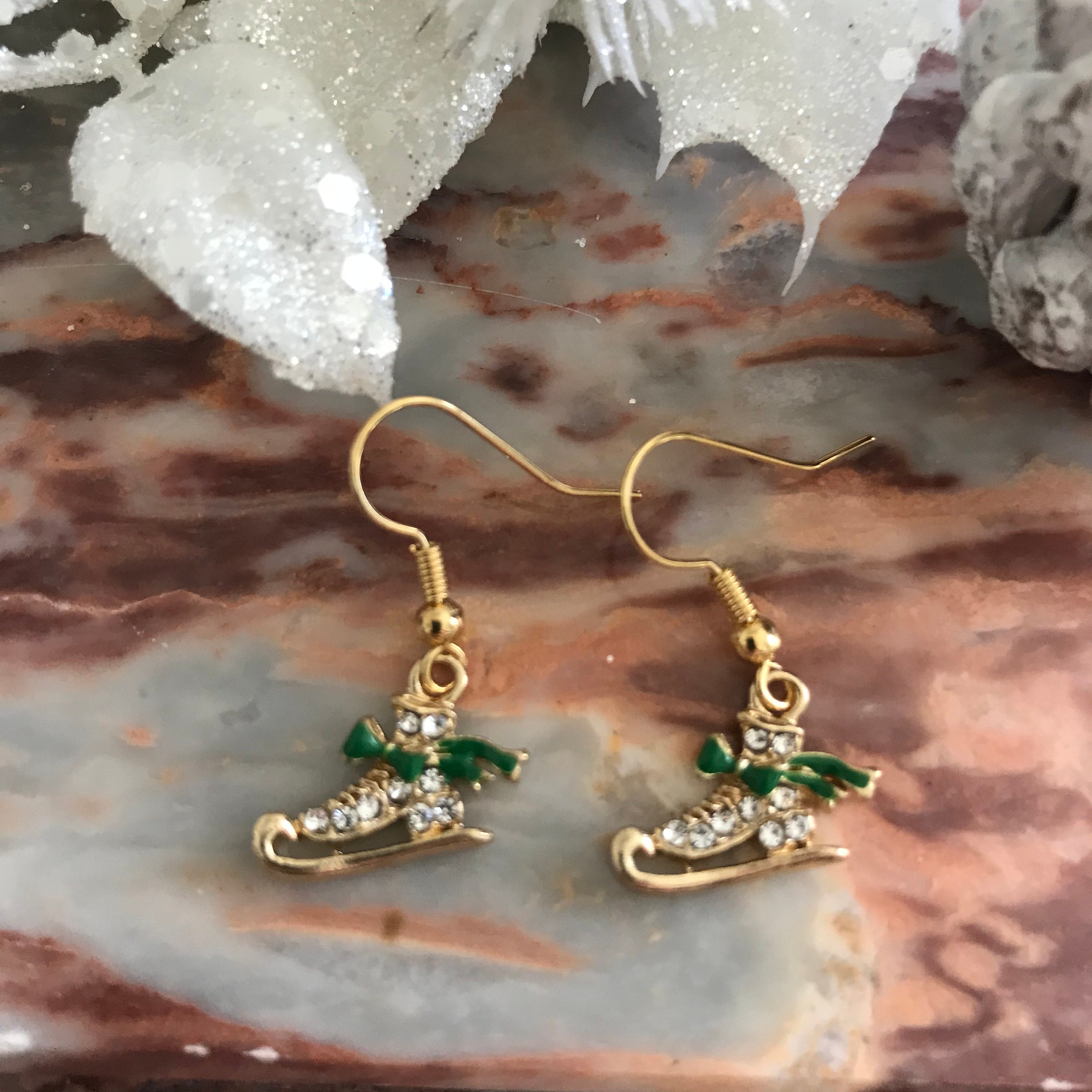 Rhinestone Ice Skate with Green Enamel bow earrings. These earrings dangle from gold plated hook ear wires. Very pretty earrings for the ice skater. Great stocking stuffer.