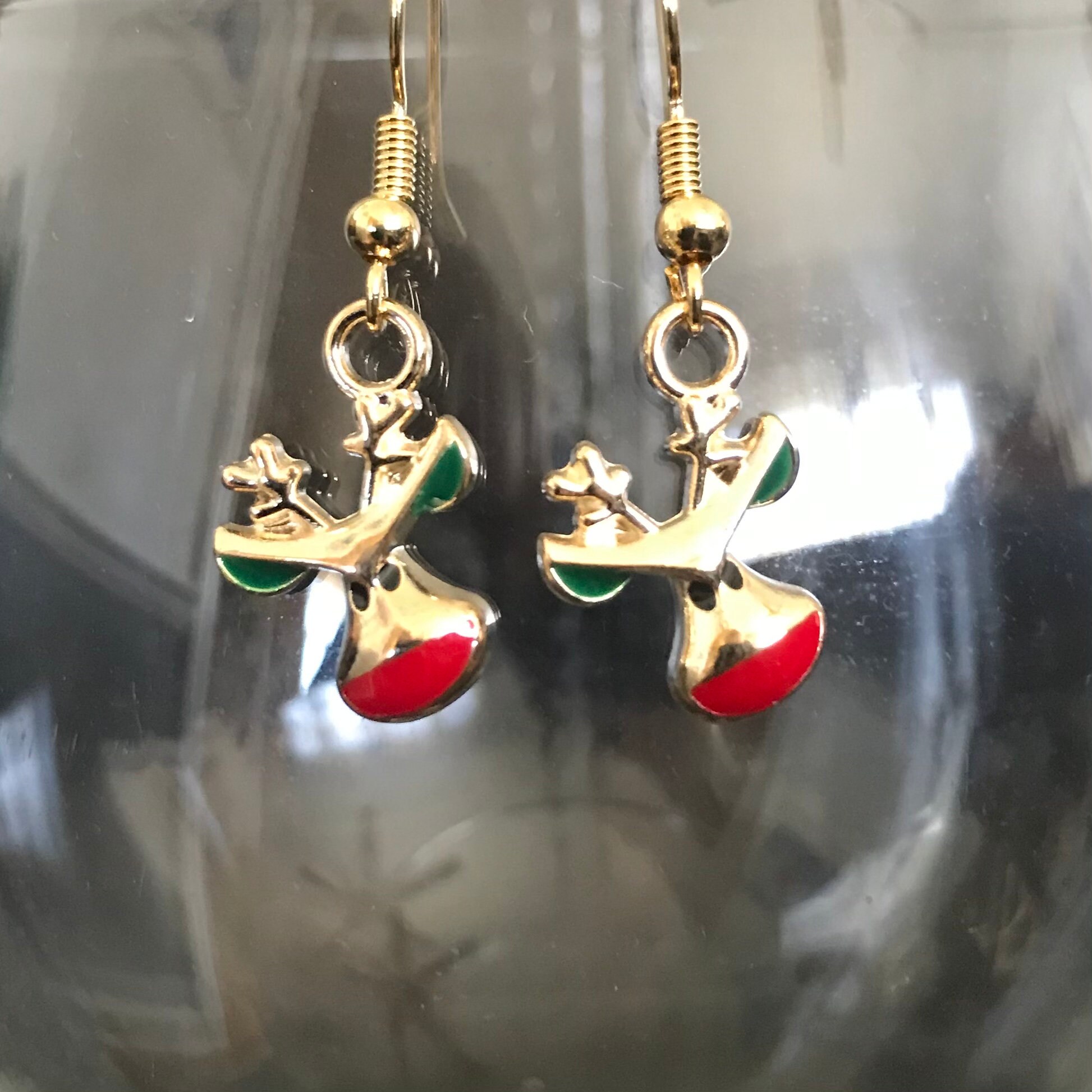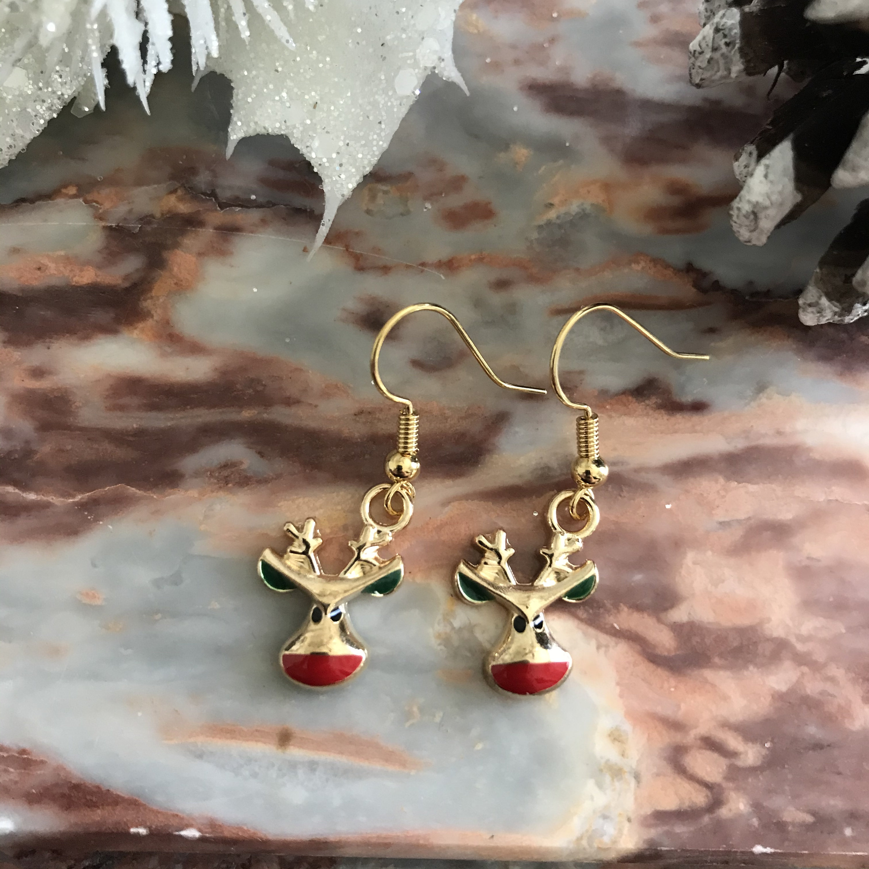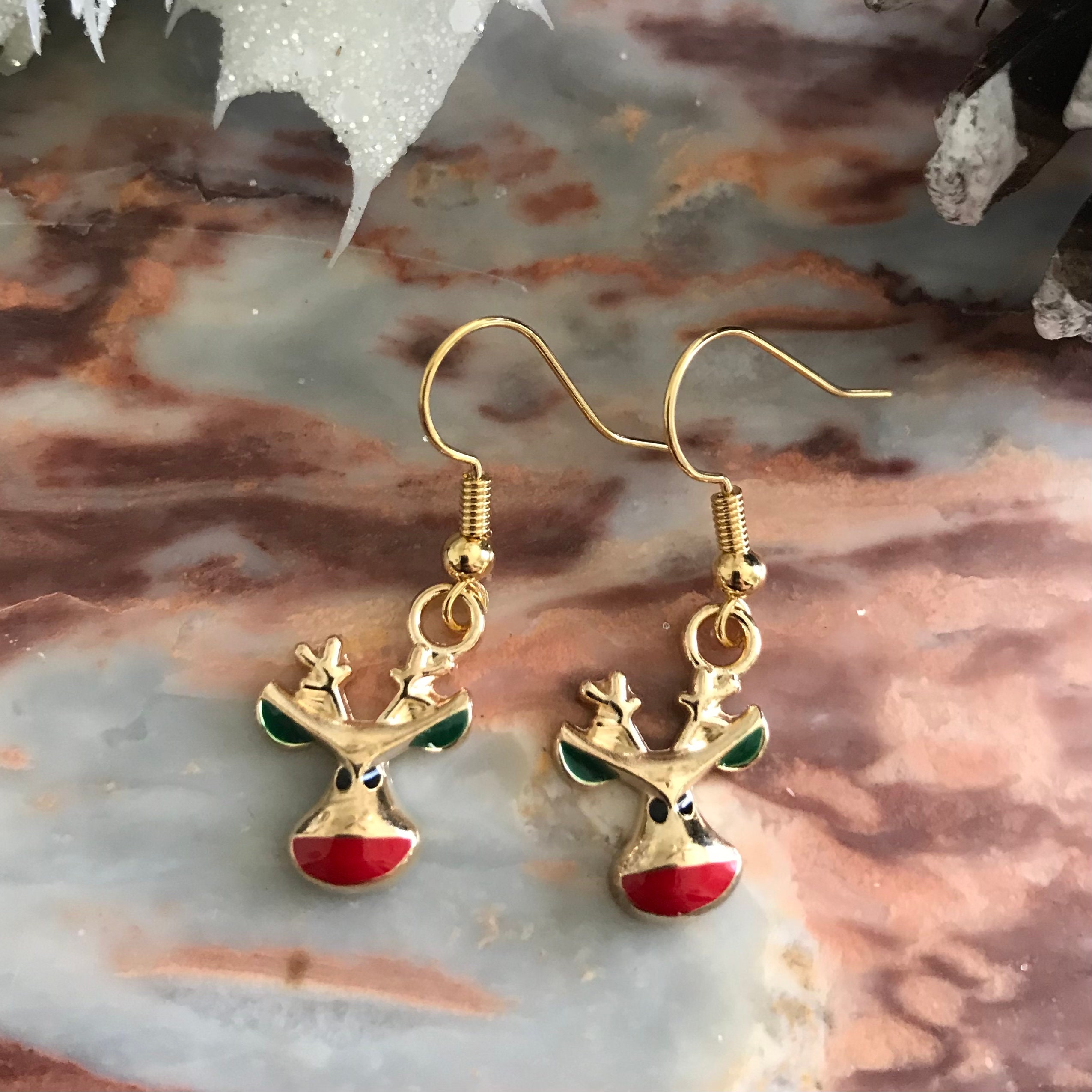 Super cute gold plated Big Red Nosed Reindeer Christmas earrings. These earrings dangle from gold plated hook ear wires. Great stocking stuffer.