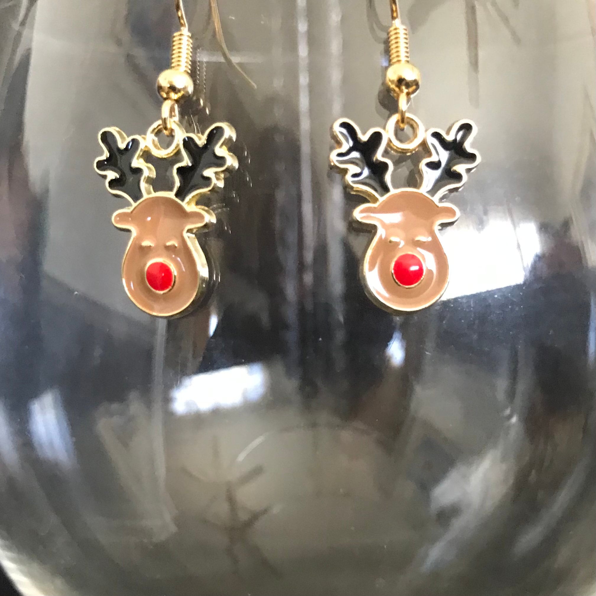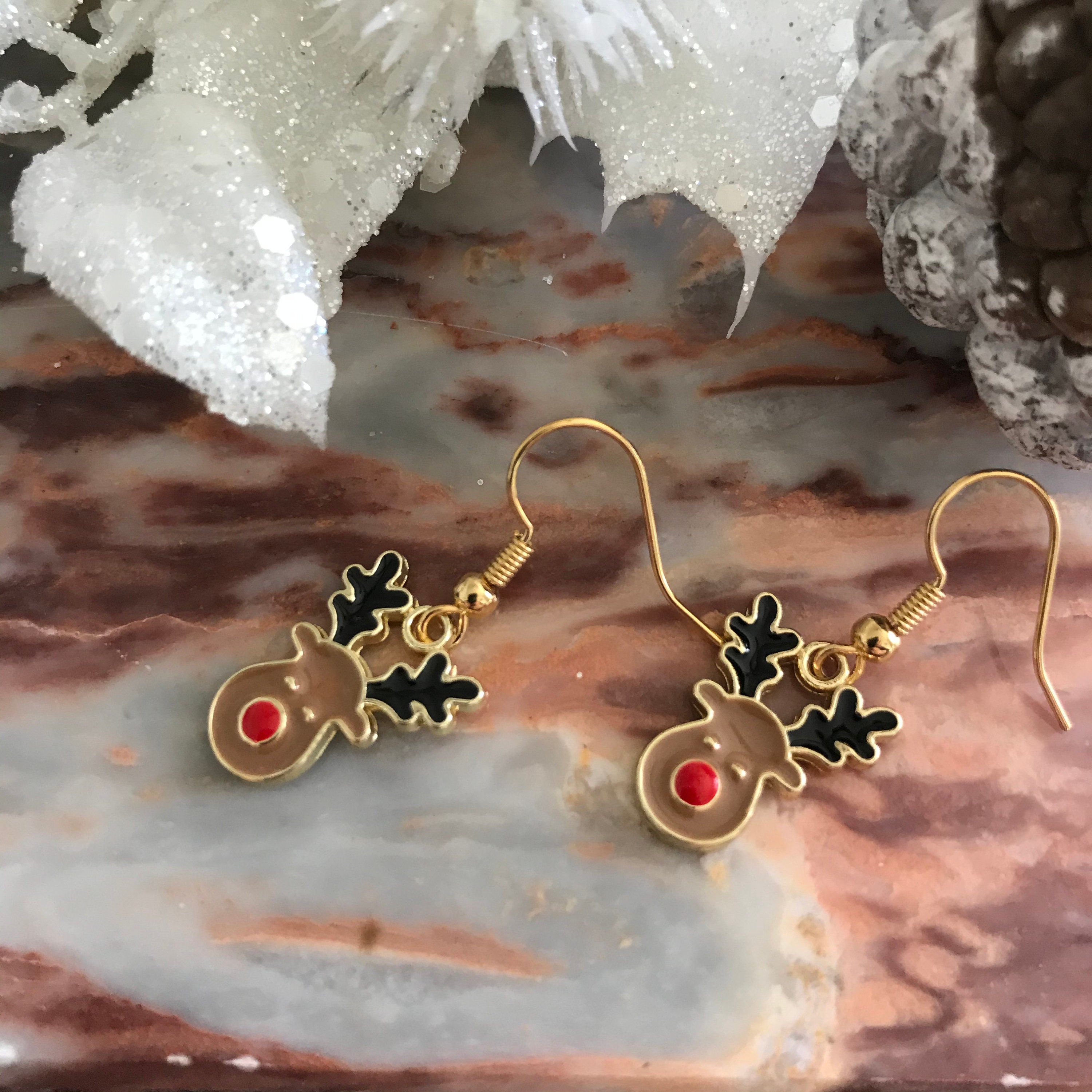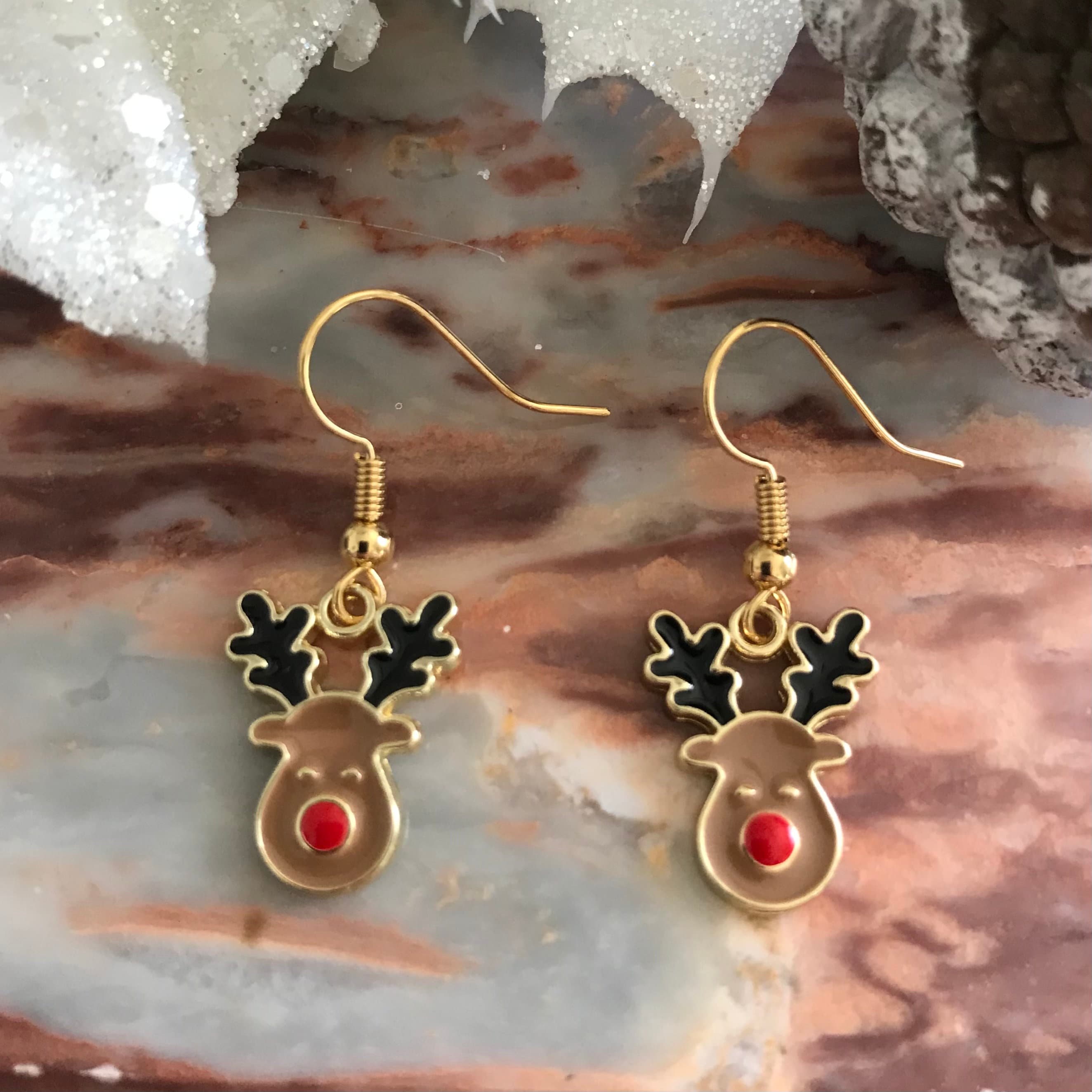 Super cute enamel Big Red Nosed Reindeer Christmas earrings. These earrings dangle from gold plated hook ear wires. Great stocking stuffer.