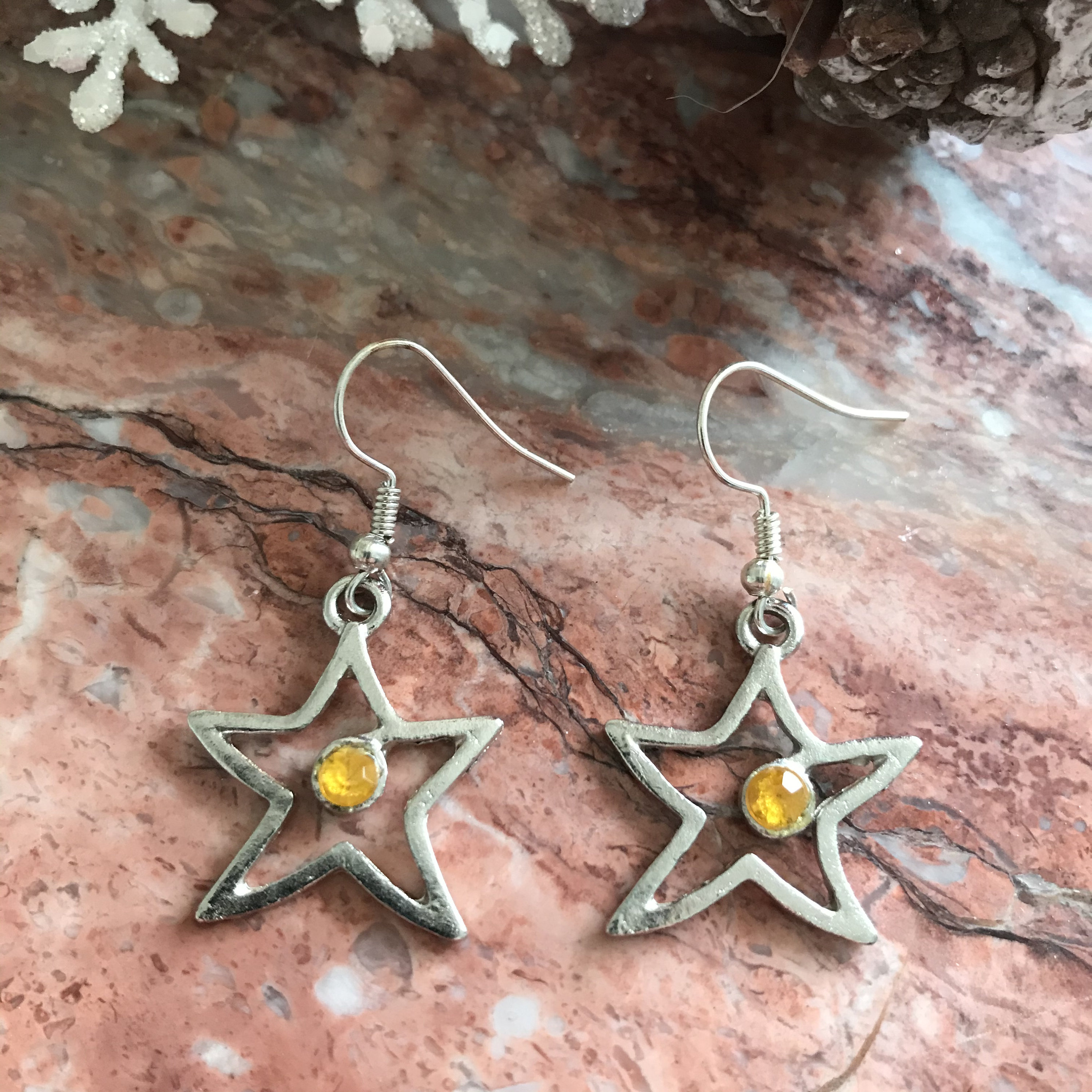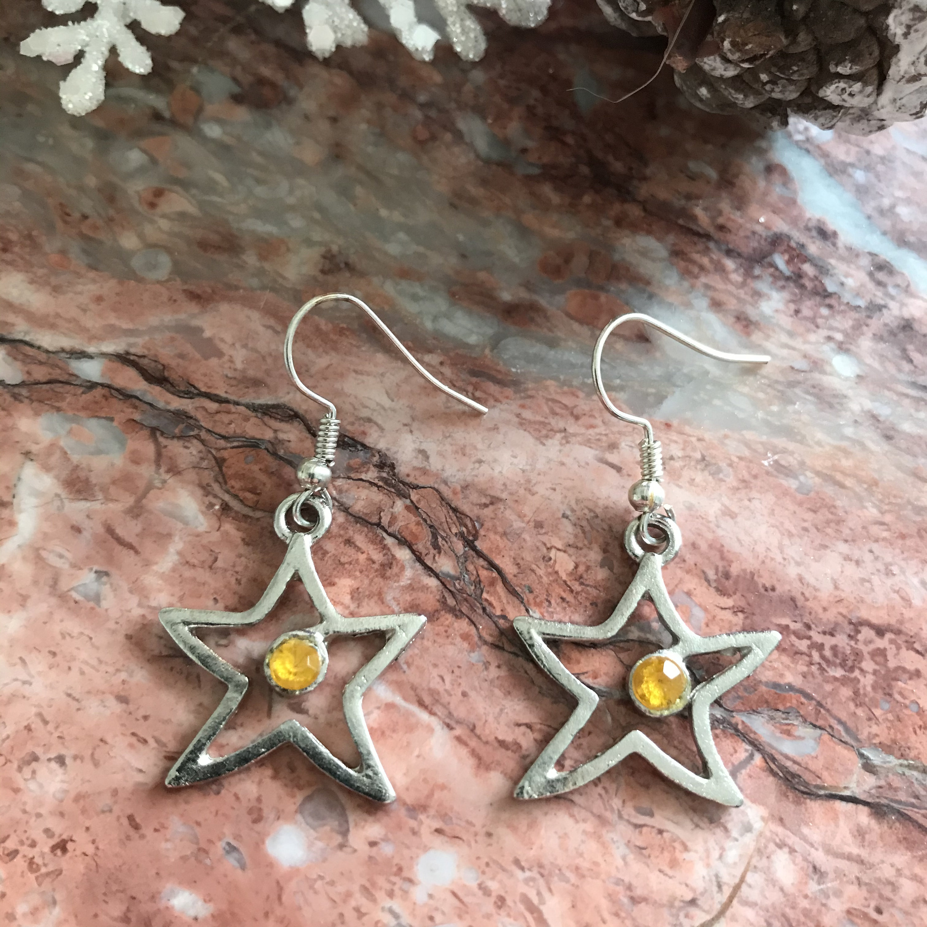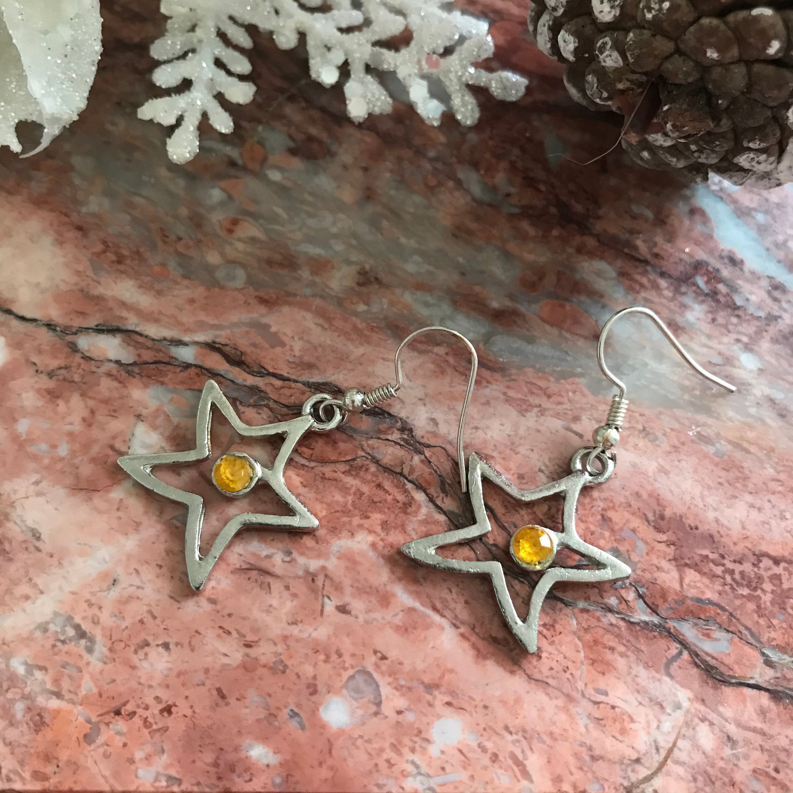 Silver plated Funky Christmas Star earrings with rhinestone. These earrings dangle from silver plated hook ear wires. Great stocking stuffer.