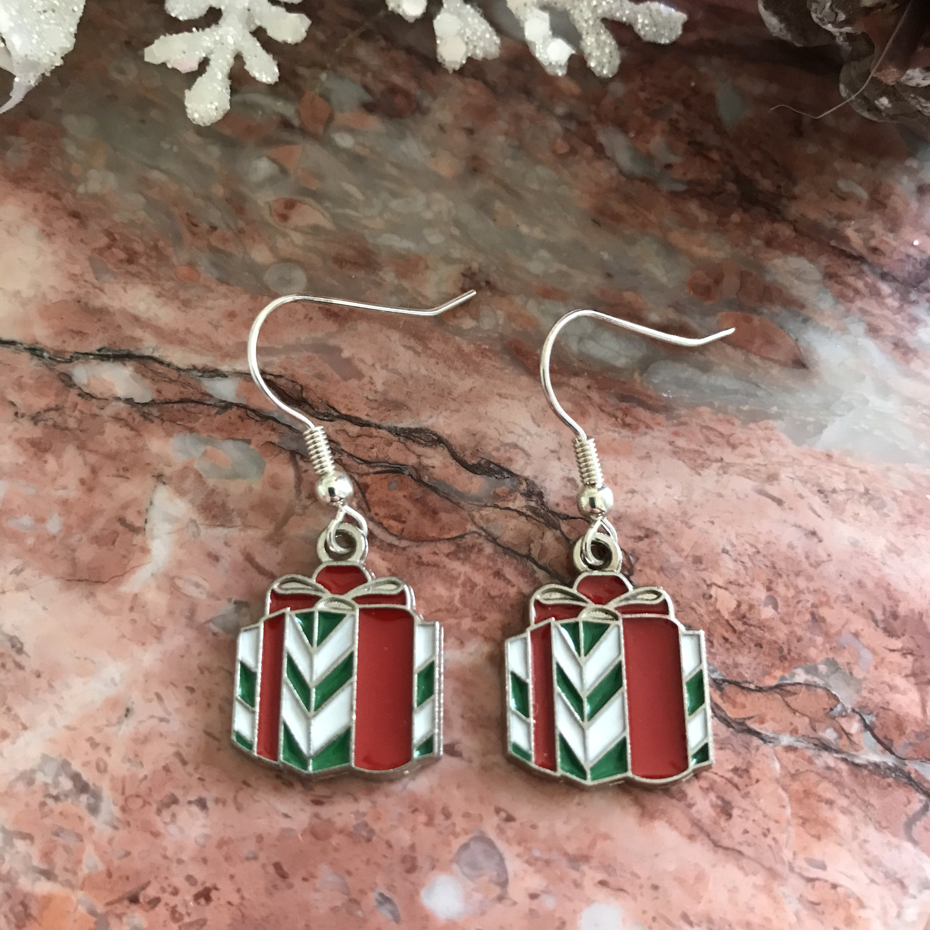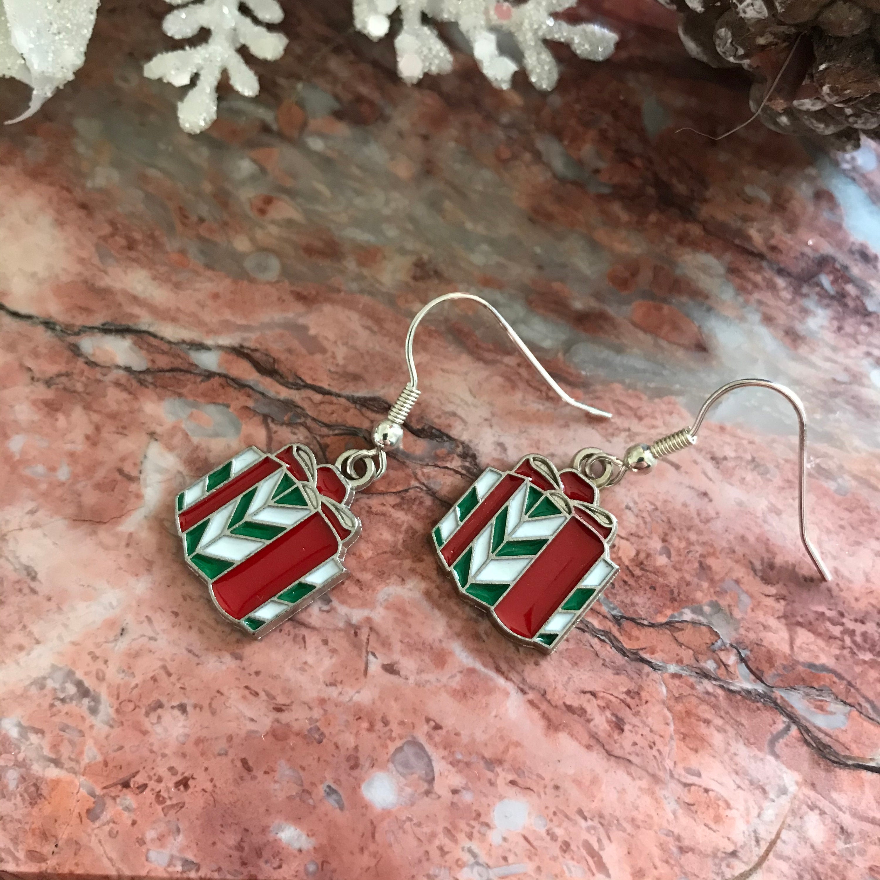 Cute enamel Christmas Present holiday earrings. These earrings dangle from silver plated hook ear wires. Great stocking stuffer.