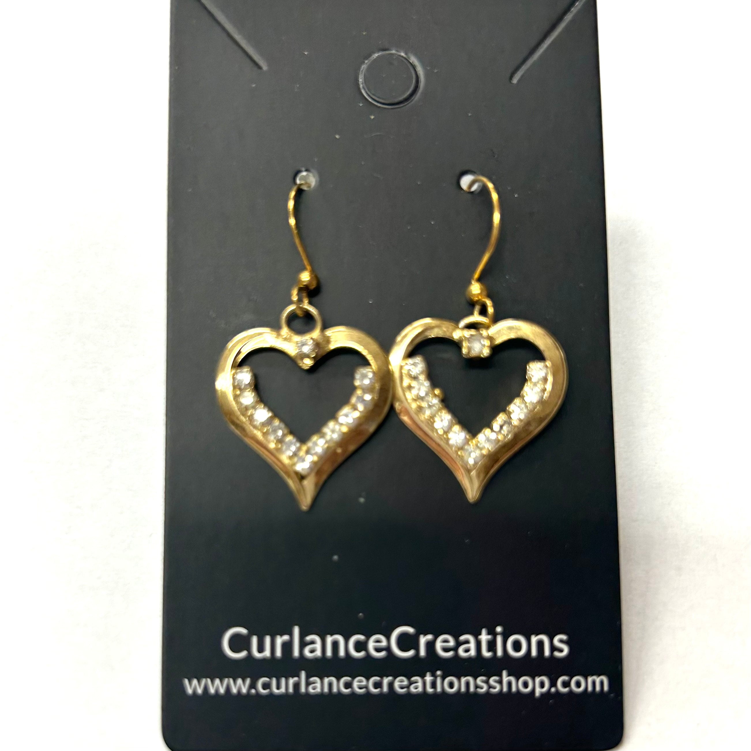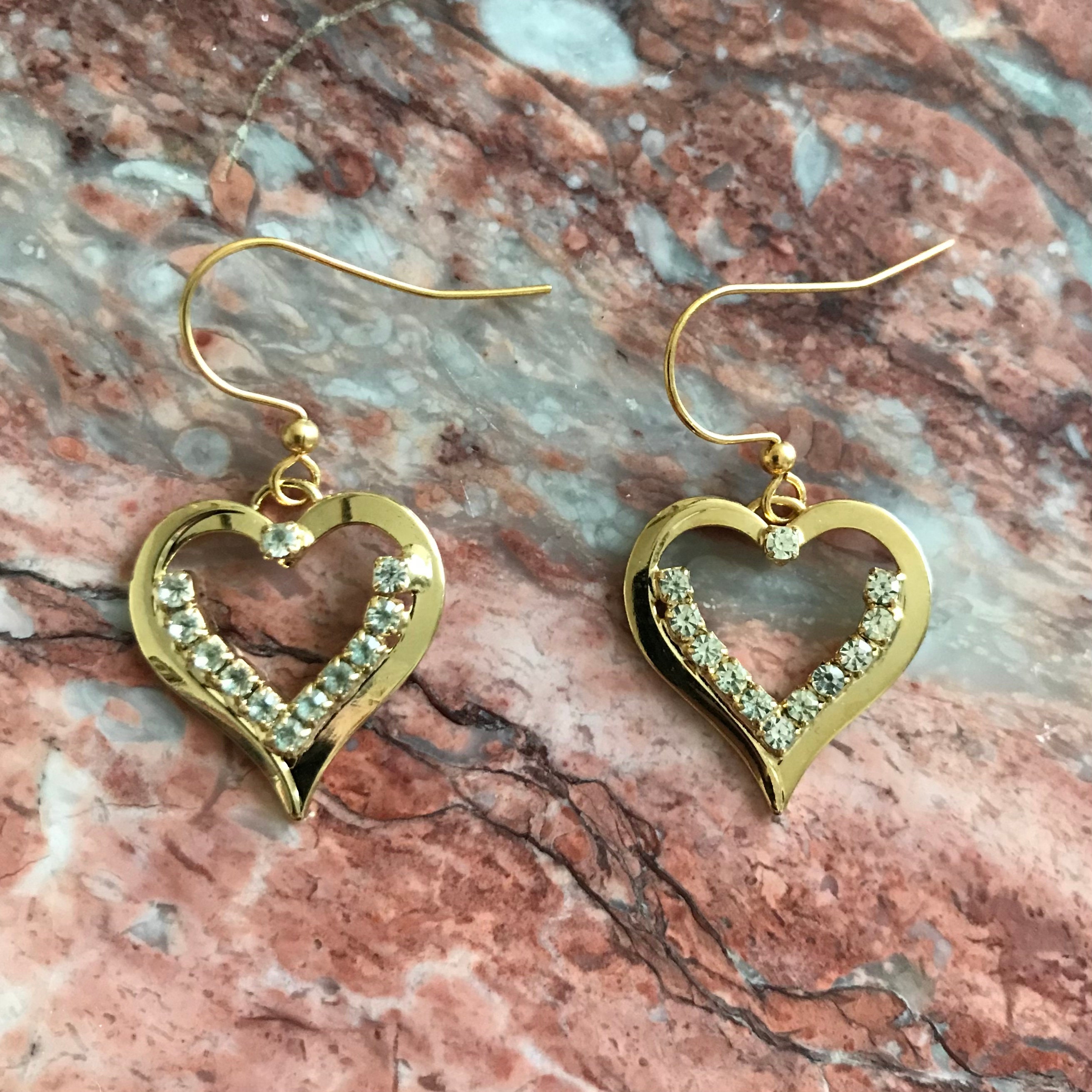 Pretty Gold Plated and Rhinestone Heart earrings. These earrings dangle from gold plated hook ear wires. Very pretty earrings!