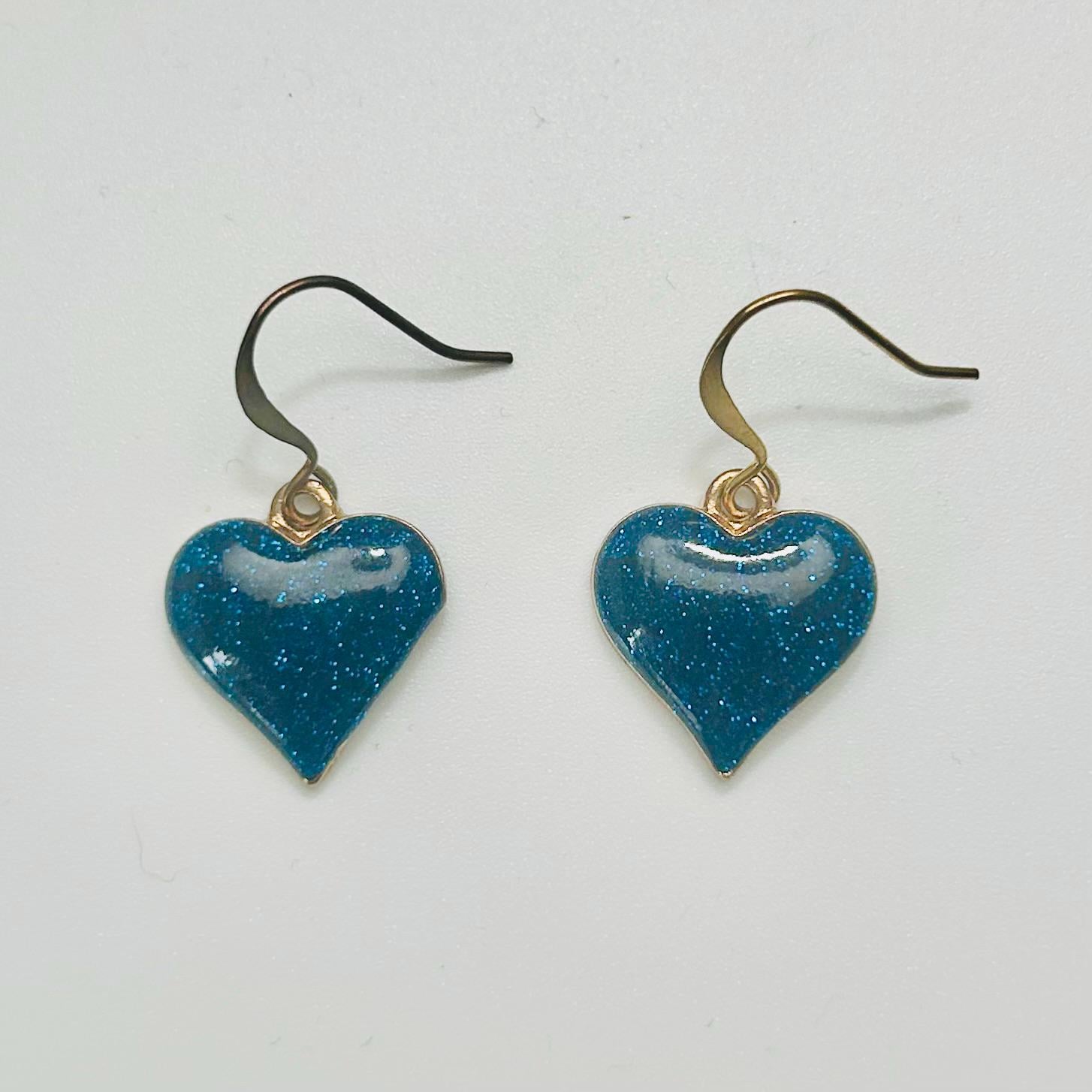Sparkly Blue Glitter Heart charm earrings. 15mm These earrings dangle from gold plated hook ear wires.